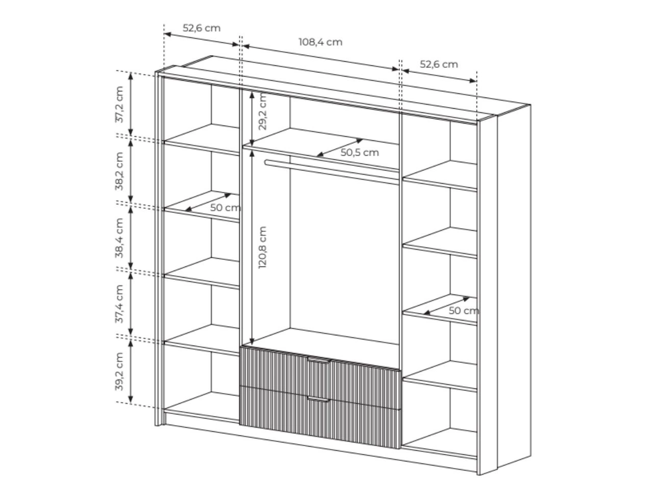 Ausgestattet mit zwei schwarzen Schubladen mit Vollauszug und geräuschlosem Schliesssystem, garantiert er einen komfortablen und geräuschlosen Gebrauch. Die Spiegel an den Türen erhöhen nicht nur die Funktionalität, sondern vergrößern auch optisch den Innenraum. Im Inneren bietet der Kleiderschrank neun geräumige Einlegeböden und eine Kleiderstange, die eine perfekte Organisation des Stauraums ermöglichen.