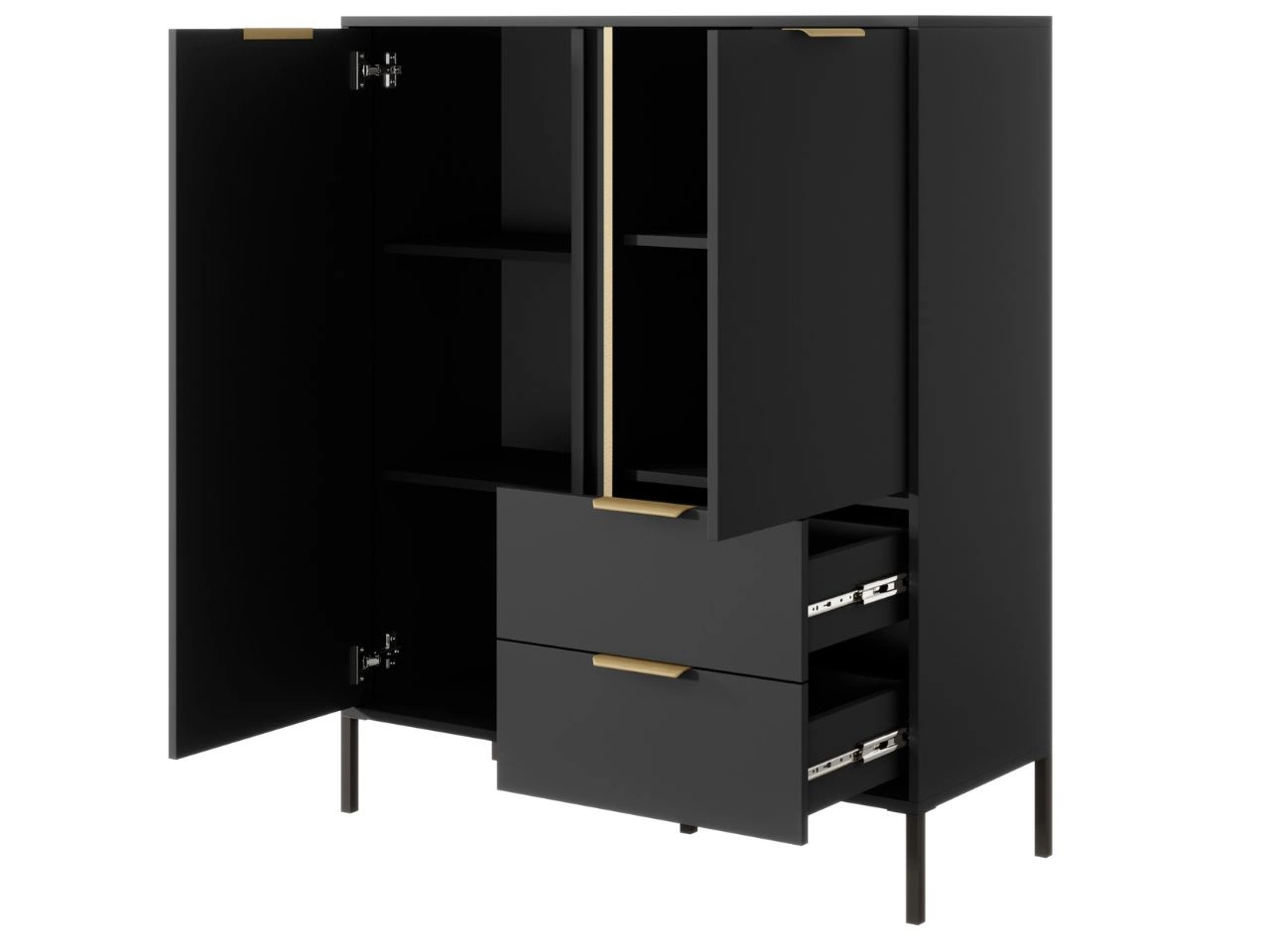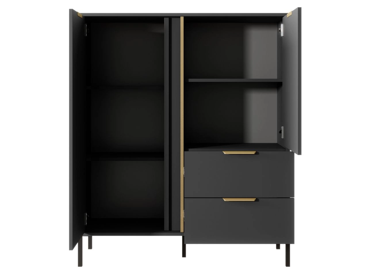 Ausgestattet mit zwei geräumigen Schubladen mit Vollauszug und zwei Schränken mit praktischen Einlegeböden bietet er viel Stauraum. Eingelassene Griffe sorgen für bequemes Öffnen und schwarze Metallbeine verleihen der Struktur einen dezenten und modernen Charakter. Goldakzente an den Fronten sorgen für Eleganz und harmonieren harmonisch mit den Griffen im gleichen Farbton.