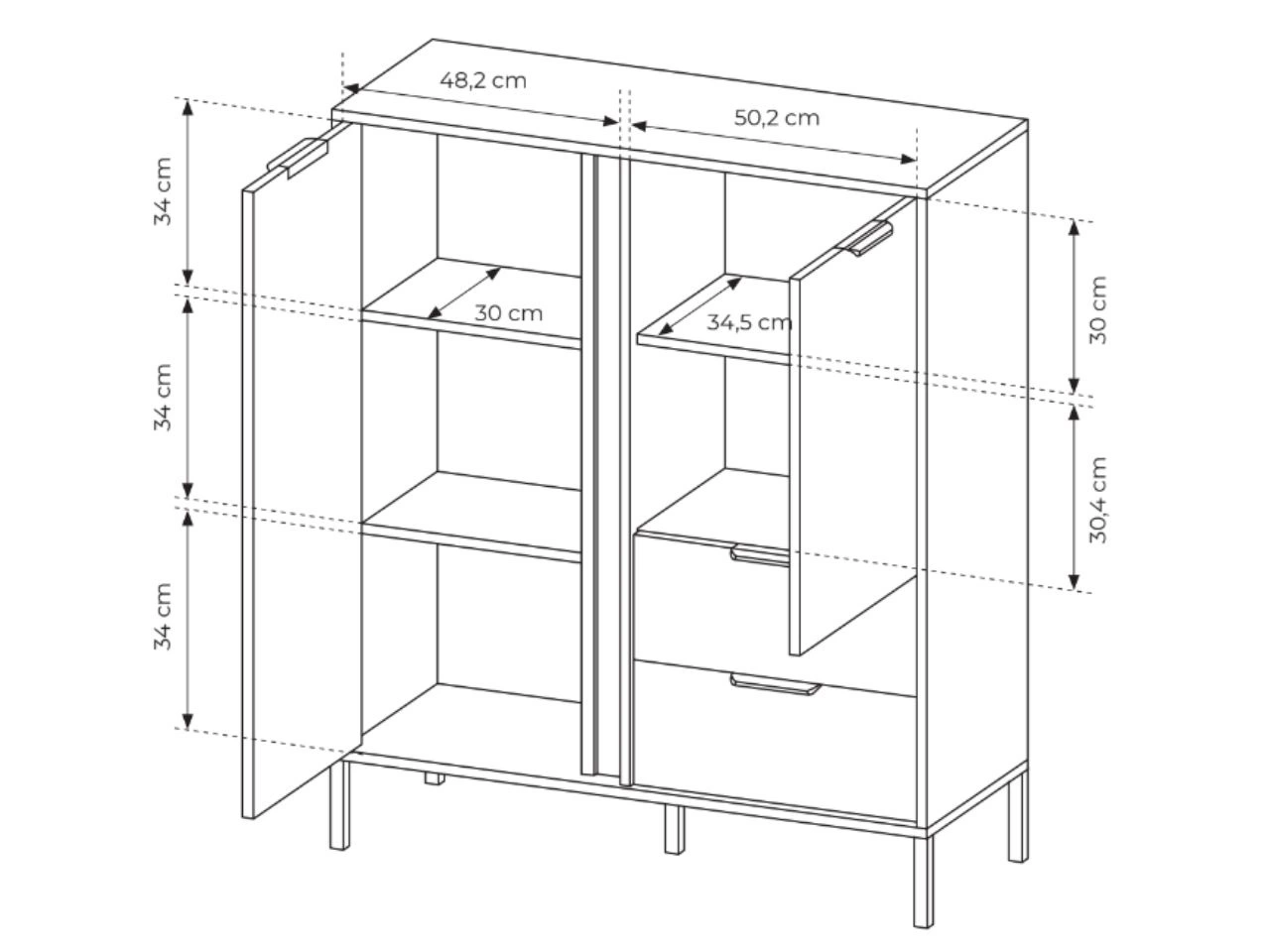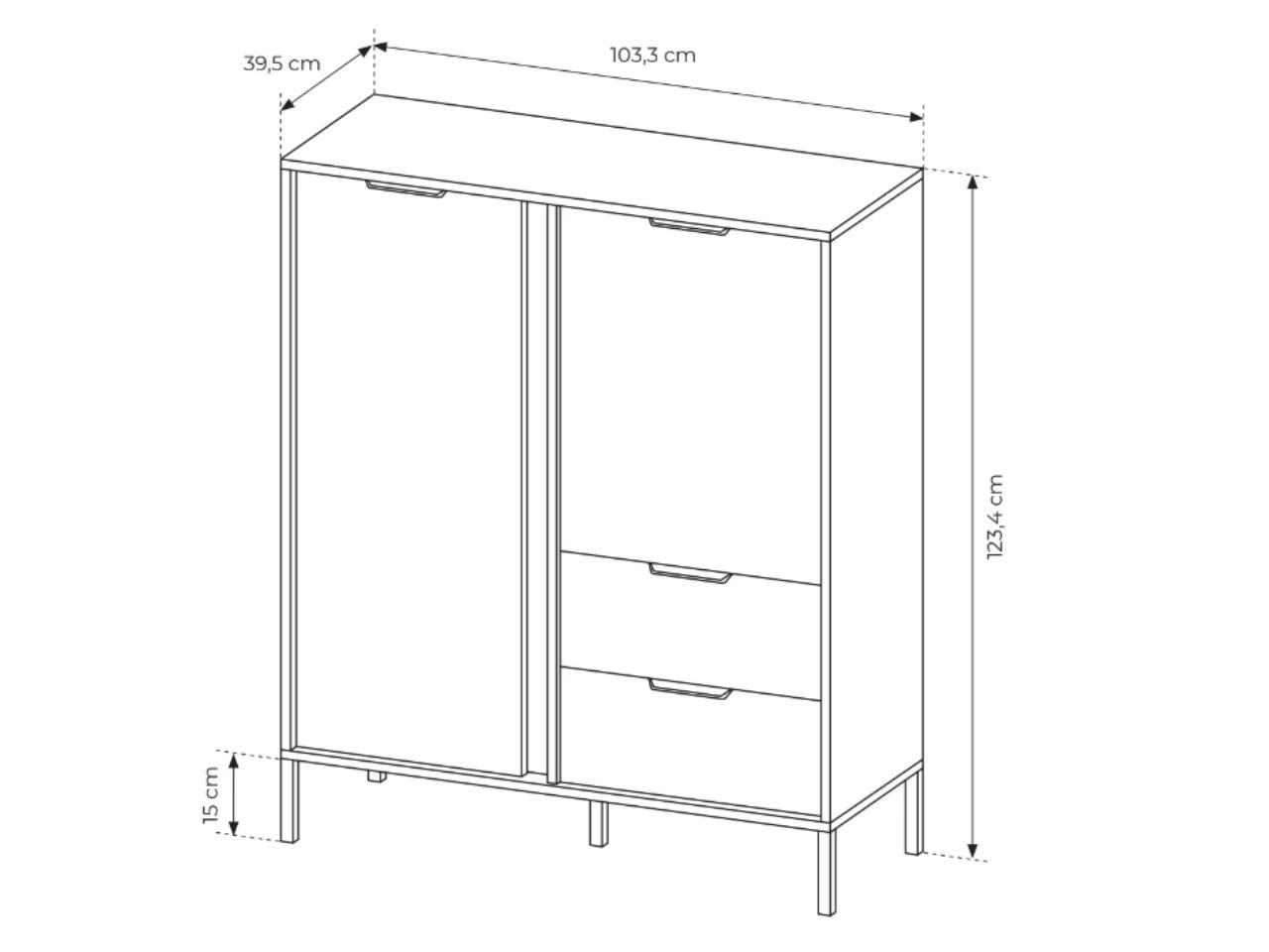 Hohe Kommode Drino mit zwei Schränken und Schubladen ist eine ideale Lösung für Menschen, die funktionale und stilvolle Möbel für das Wohnzimmer, Schlafzimmer oder den Flur suchen.