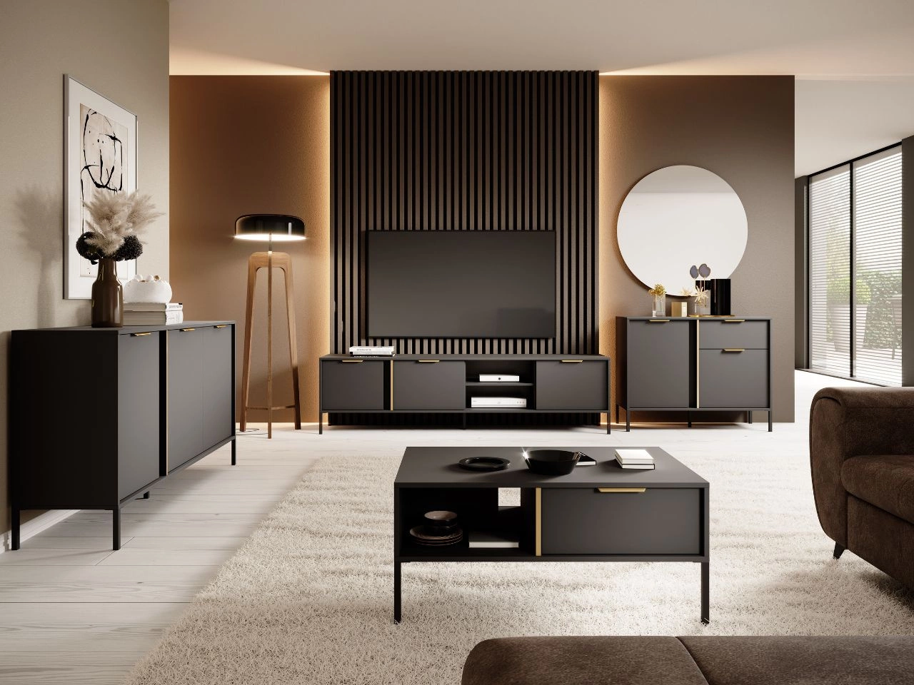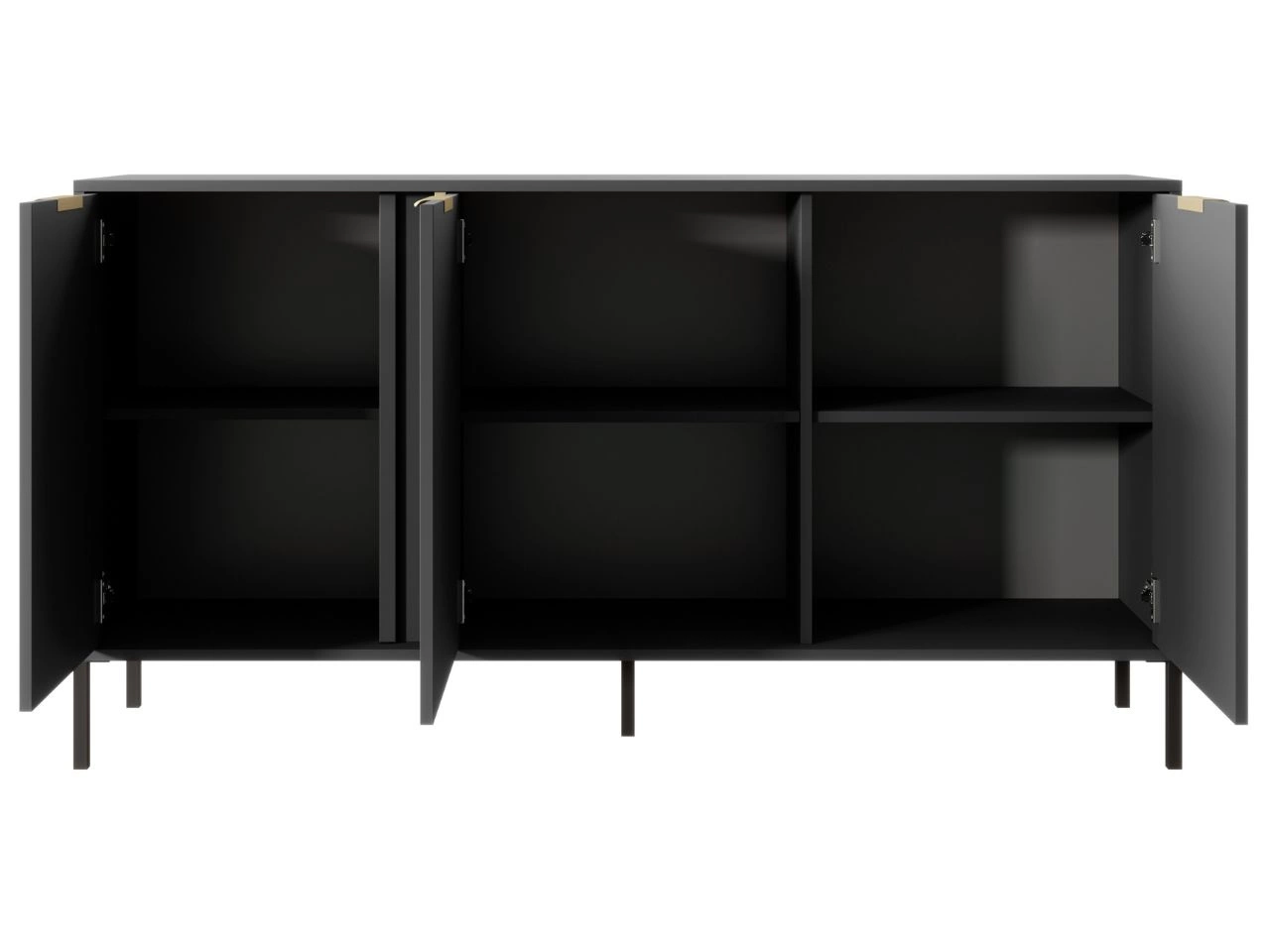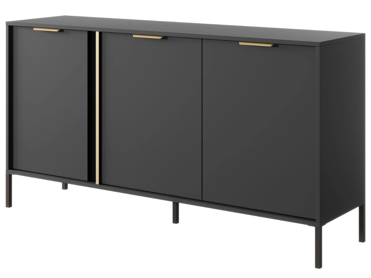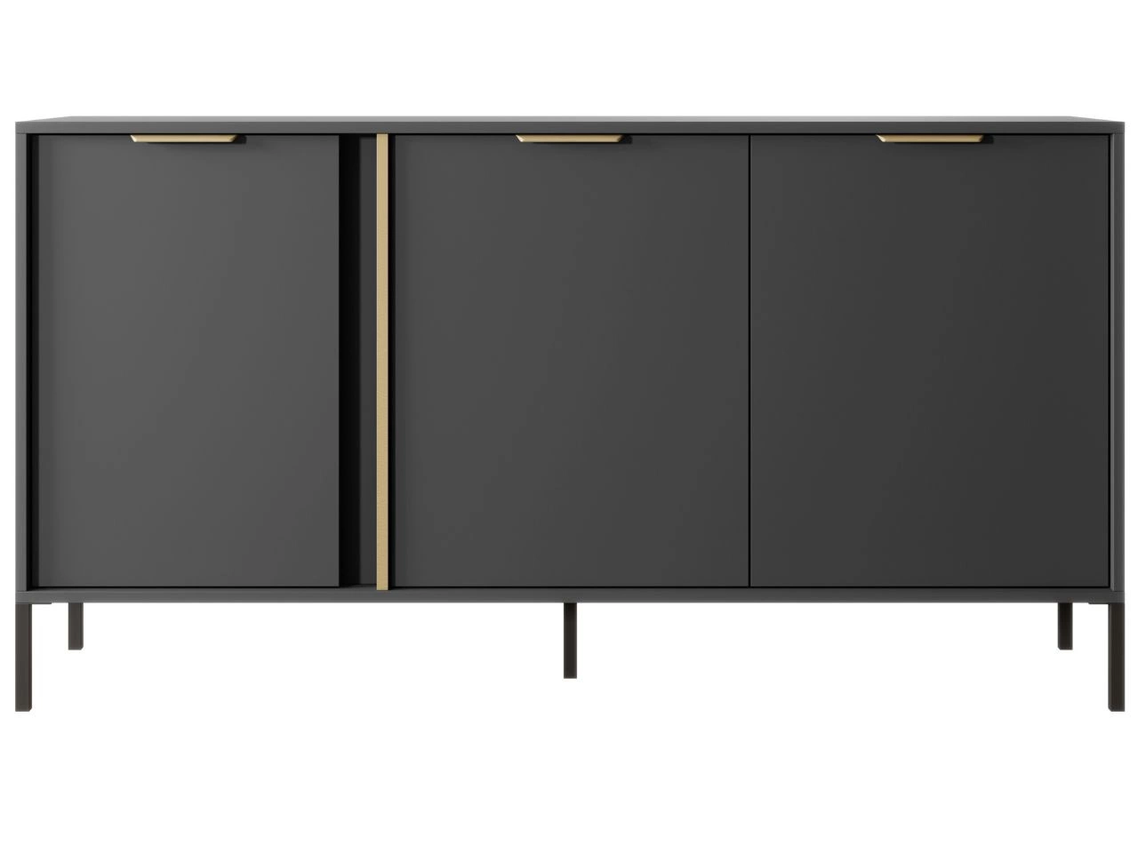 Drei geräumige Schränke mit praktischen Regalen bieten viel Stauraum und die geräumige Tischplatte eignet sich perfekt als Ablagefläche für Dekorationen, Bücher oder Fotos. Eingelassene Griffe garantieren Bedienkomfort und schwarze Metallbeine verleihen der Kommode Leichtigkeit und einen modernen Charakter. Golddetails an den Fronten sorgen für Eleganz und harmonieren stilvoll mit Griffen im gleichen Farbton.