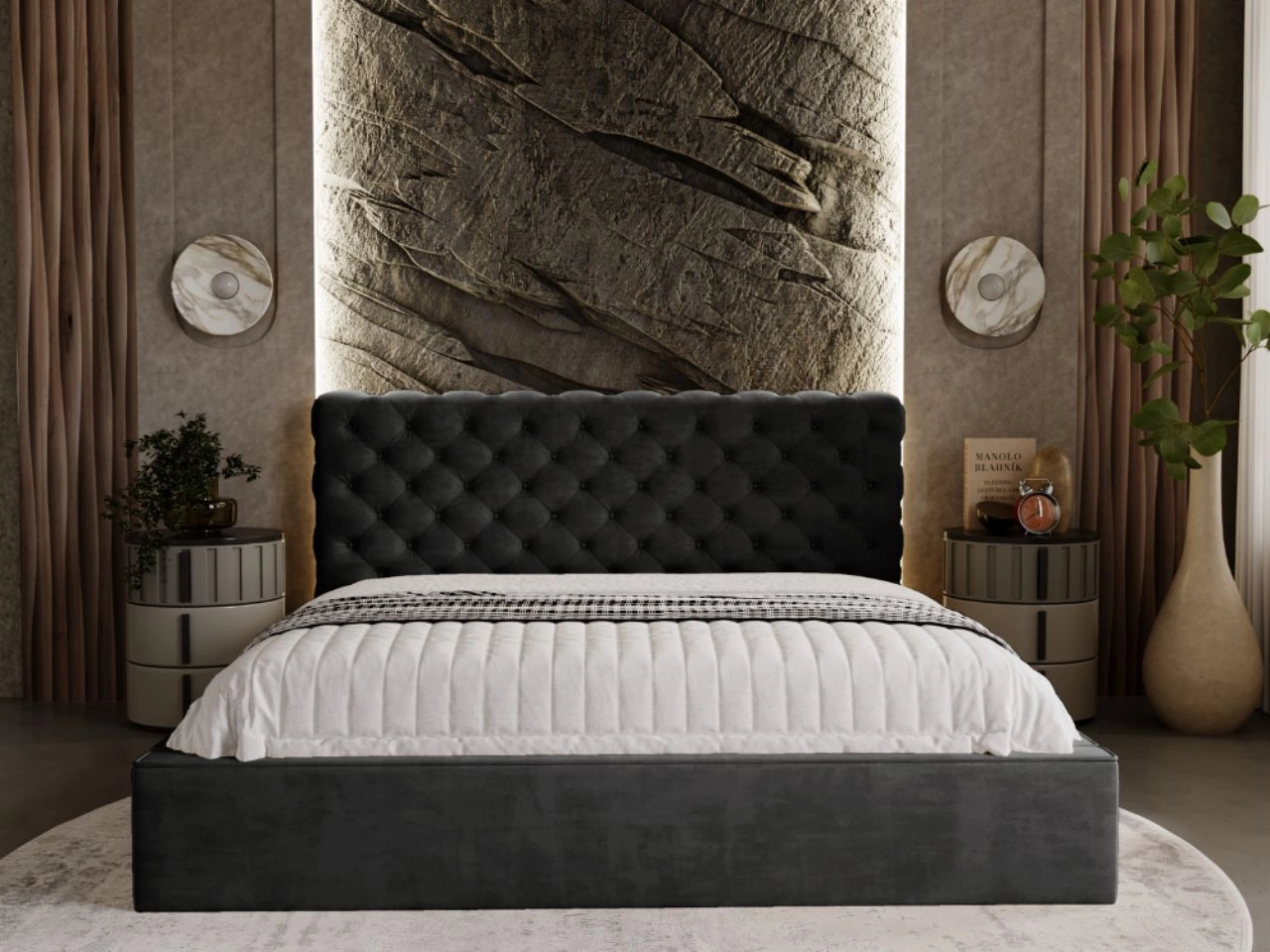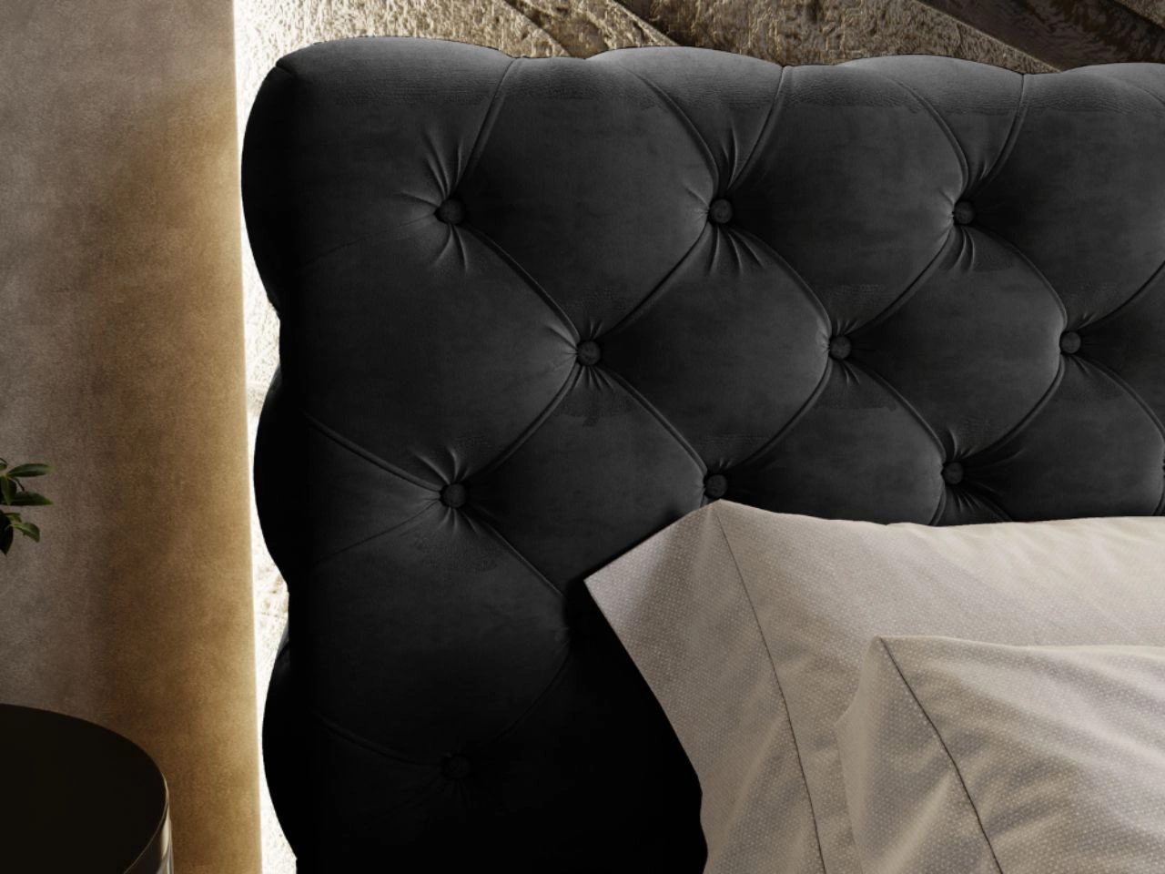 Polsterbett Apollo ist die perfekte Wahl für Liebhaber des eleganten Stils. Es verfügt über ein hohes, gestepptes Kopfteil, das mit einem hochwertigen Veloursstoff bezogen ist. Inspiriert vom Barockstil ist Bett Apollo mit zahlreichen Ornamenten und Accessoires reich verziert. Tief gesteppte Knöpfe verleihen ihm zusätzlichen Charme.
