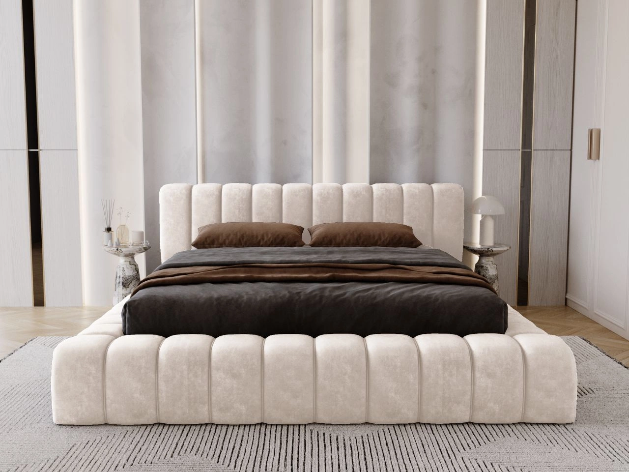 Das Polsterbett Italia ist eine interessante Wahl für alle, die modernes Design und hohen Komfort schätzen. Dieses Möbelstück besticht vor allem durch stilvolle vertikale Nähte und ein weiches, hohes Kopfteil. Letzteres erfüllt nicht nur eine dekorative Rolle, sondern hat auch einen praktischen Aspekt, da es ermöglicht, sich bequem anzulehnen, während man liest oder fern sieht. Sowohl der Bettrahmen als auch das Kopfteil sind mit dicker und weicher Polsterung ausgestattet, was eine gemütliche Atmosphäre im Schlafzimmer schafft.
