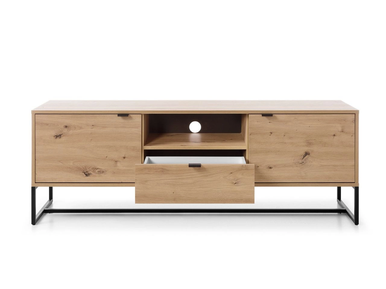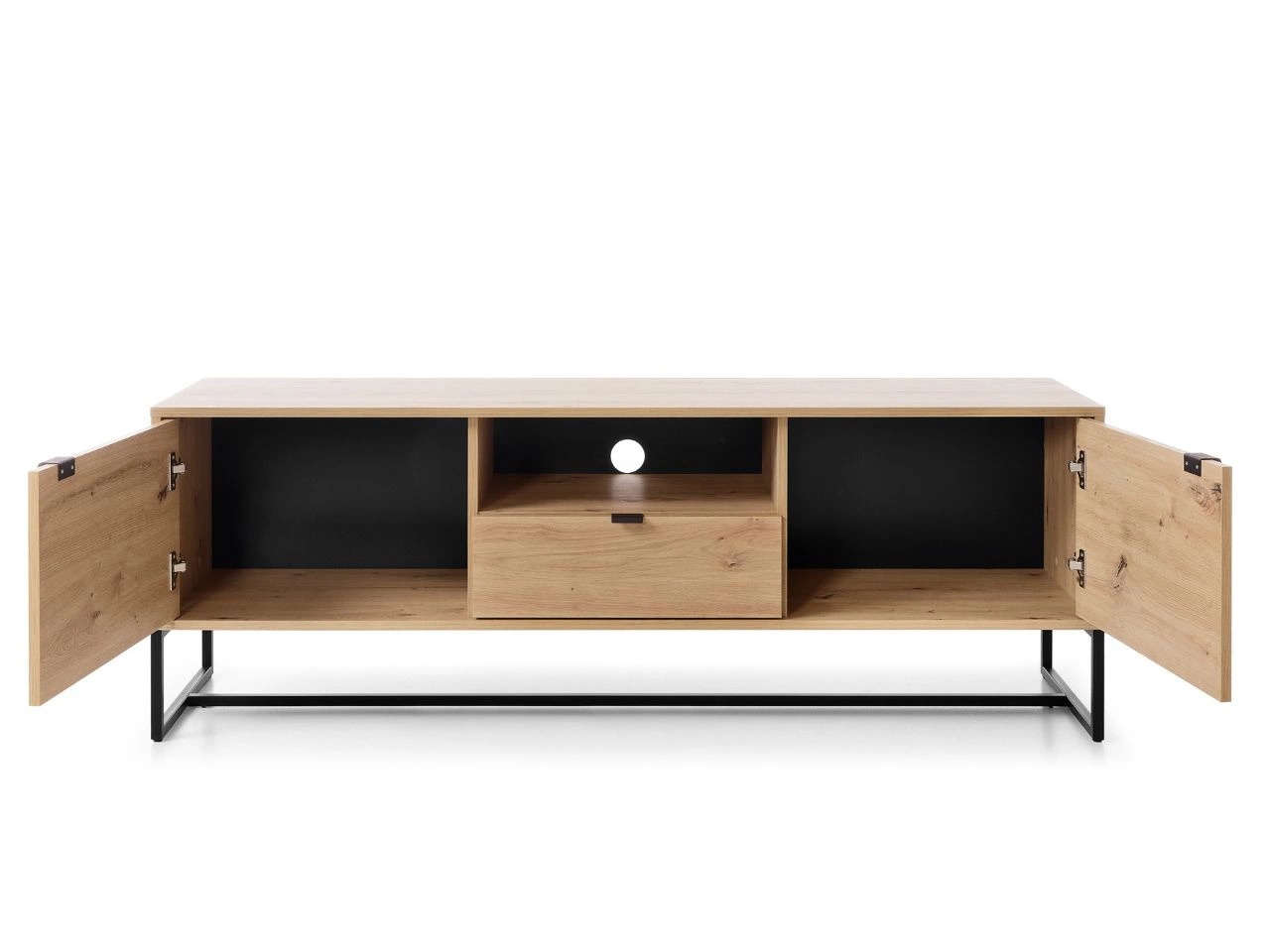 Das Modell bietet eine durchdachte Aufteilung. Auf beiden Seiten befinden sich geräumige Schränke mit Türen, in denen sich Zubehör und Alltagsgegenstände leicht verstauen lassen. Im mittleren Bereich wurde ein offenes Fach mit Kabeldurchführung integriert – ideal für Receiver, Konsolen oder Modems. Darunter befindet sich eine praktische Schublade, die Ordnung im Medienbereich schafft.