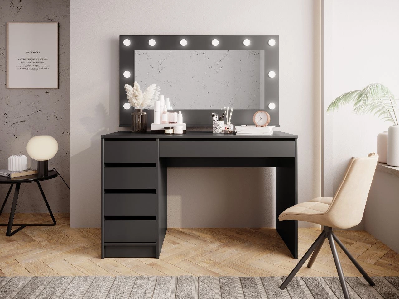 Der moderne Anes-Schminktisch ist ein stilvolles und praktisches Möbelstück, das sich perfekt für das Schlafzimmer oder das Wohnzimmer eignet. Er bietet einen bequemen Platz zum Auftragen von Make-up und kann dank seines universellen Designs auch als Schreibtisch verwendet werden. Der Schminktisch Anes ist eine Kombination aus Eleganz und Funktionalität. Ausgestattet mit fünf Schubladen erleichtert es die Organisation von Kosmetika, Schmuck und anderen notwendigen Gegenständen und trägt so zur Aufrechterhaltung von Ordnung und Ästhetik im Raum bei.