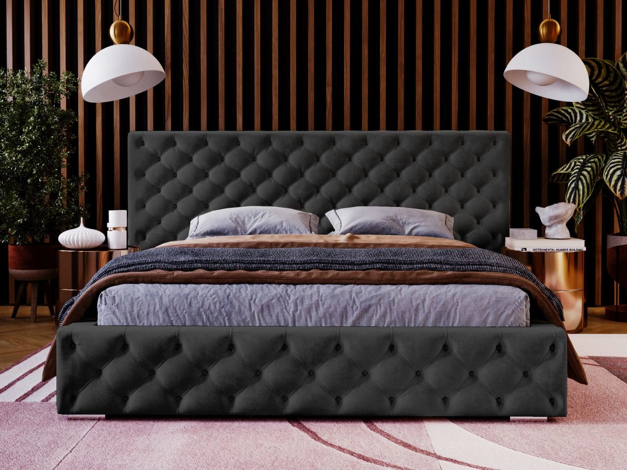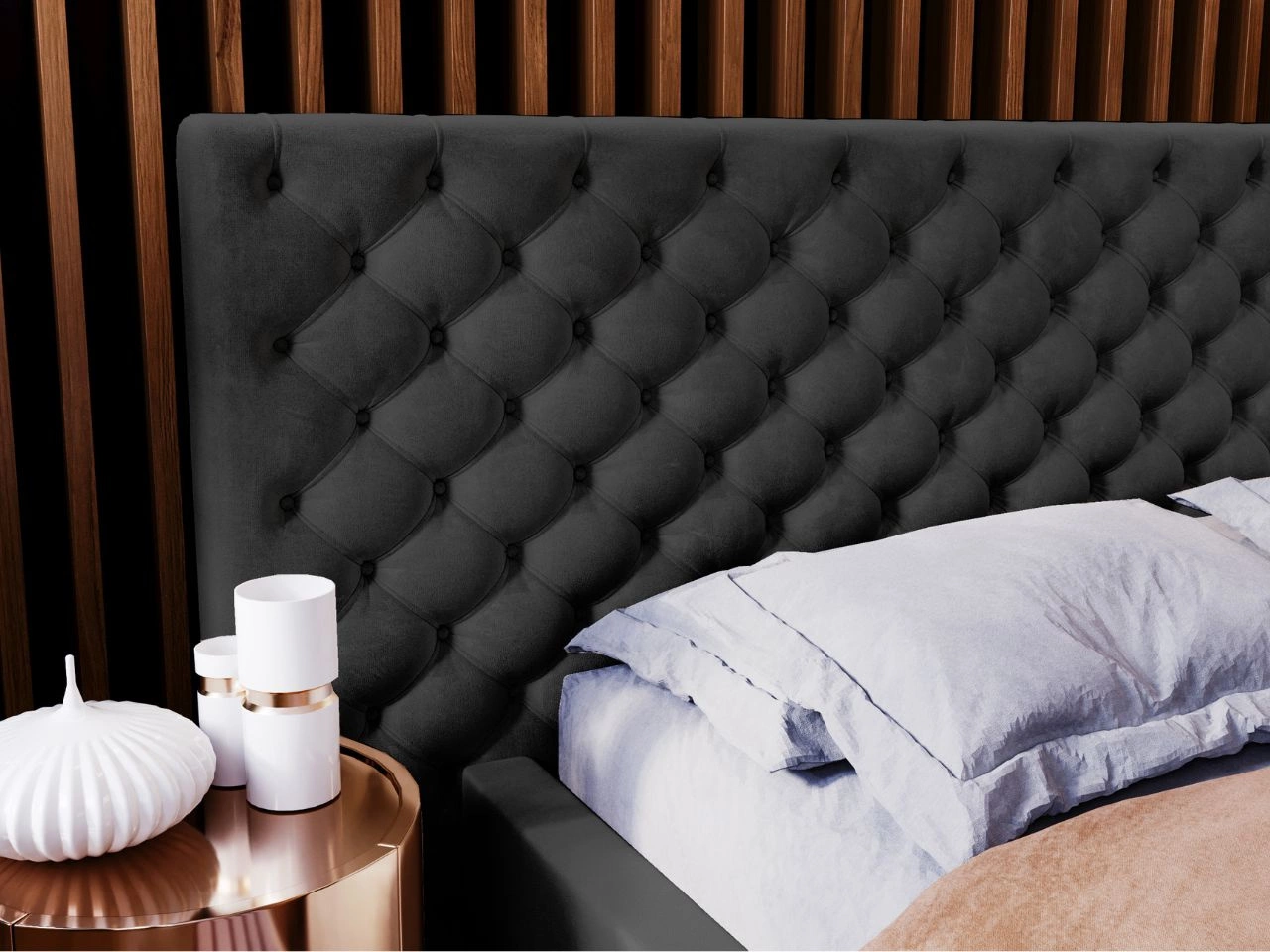 Im barocken Stil inspiriert, zeichnet sich  Chesterfield-Bett Madera durch zahlreiche Verzierungen und Details aus. Tief geknöpfte Knöpfe verleihen ihm einen einzigartigen Charme und machen es zum Mittelpunkt jedes Schlafzimmers. Doppelbett Madera es zeichnet sich auch durch ein hohes Kopfteil aus, das ihm Solidität und einen außergewöhnlichen Charakter verleiht. Zahlreiche Nähte und Knöpfungen verleihen ihm Eleganz und  passen perfekt zu glamourösen Interieurs. Bett ist mit einem geräumigen Bettkasten ausgestattet, so dass viel Stauraum vorhanden ist.