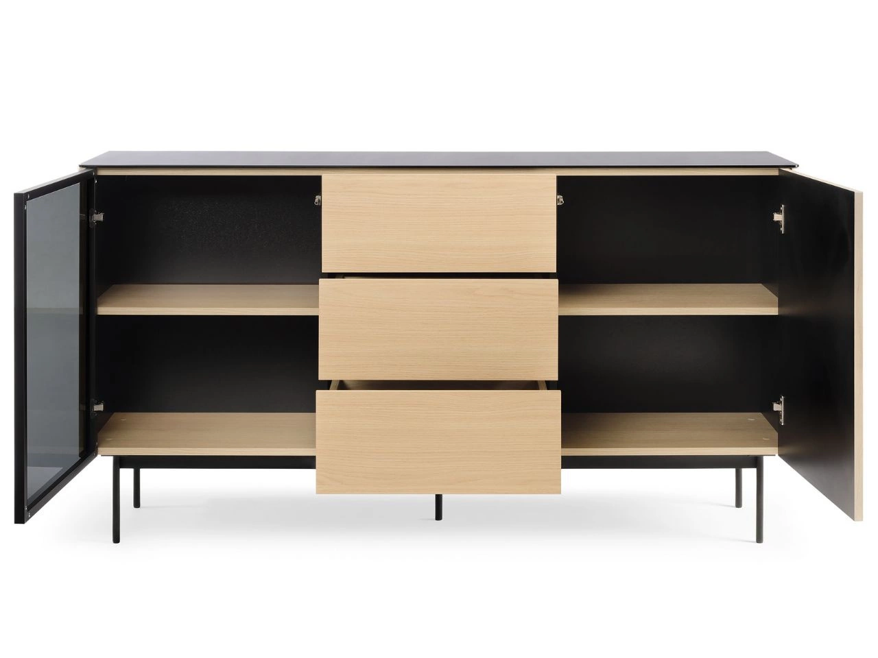 Die Kommode Auroé ist mit einem grifflosen Push-to-Open-System ausgestattet – leichtes Antippen genügt, um Türen und Schubladen zu öffnen. Der Korpus wird aus hochwertiger, laminierter Möbelplatte gefertigt, deren Kanten mit einer ABS-Kante geschützt sind. Diese Verarbeitung erhöht die Widerstandsfähigkeit gegen kleine Kratzer und mechanische Beschädigungen und reduziert das Eindringen von Feuchtigkeit in das Platteninnere. Die Kommode Auroé steht auf schwarzen Metallfüßen mit einem zusätzlichen mittleren Stützfuß, wodurch das Möbel leicht, modern und gleichzeitig sehr stabil wirkt.