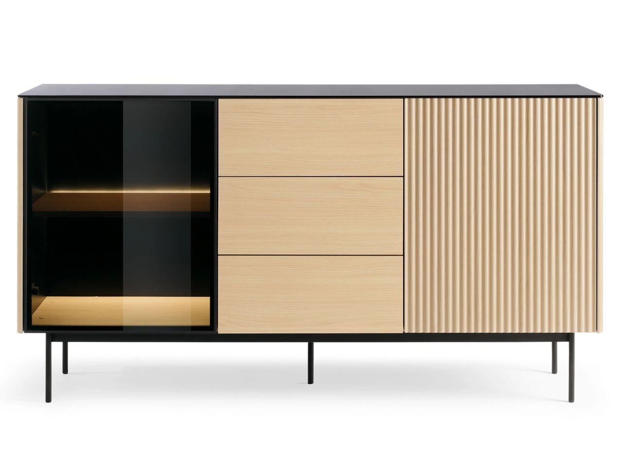 Die zweitürige Kommode Auroé besticht vor allem durch ihre ausgefallene Frontgestaltung: Auf der rechten Tür zieht eine markante senkrechte Riffelstruktur sofort die Blicke auf sich, während die linke Tür mit einer Vitrinenfront aus getöntem Sicherheitsglas gestaltet ist. Das Innere der Glasvitrine wird zusätzlich durch eine LED-Beleuchtung (Netzbetrieb) in Szene gesetzt. In der Mitte der Kommode befinden sich drei Schubladen, die dank Kugelführungen mit Vollauszug einen komfortablen Zugriff auf den gesamten Stauraum ermöglichen.