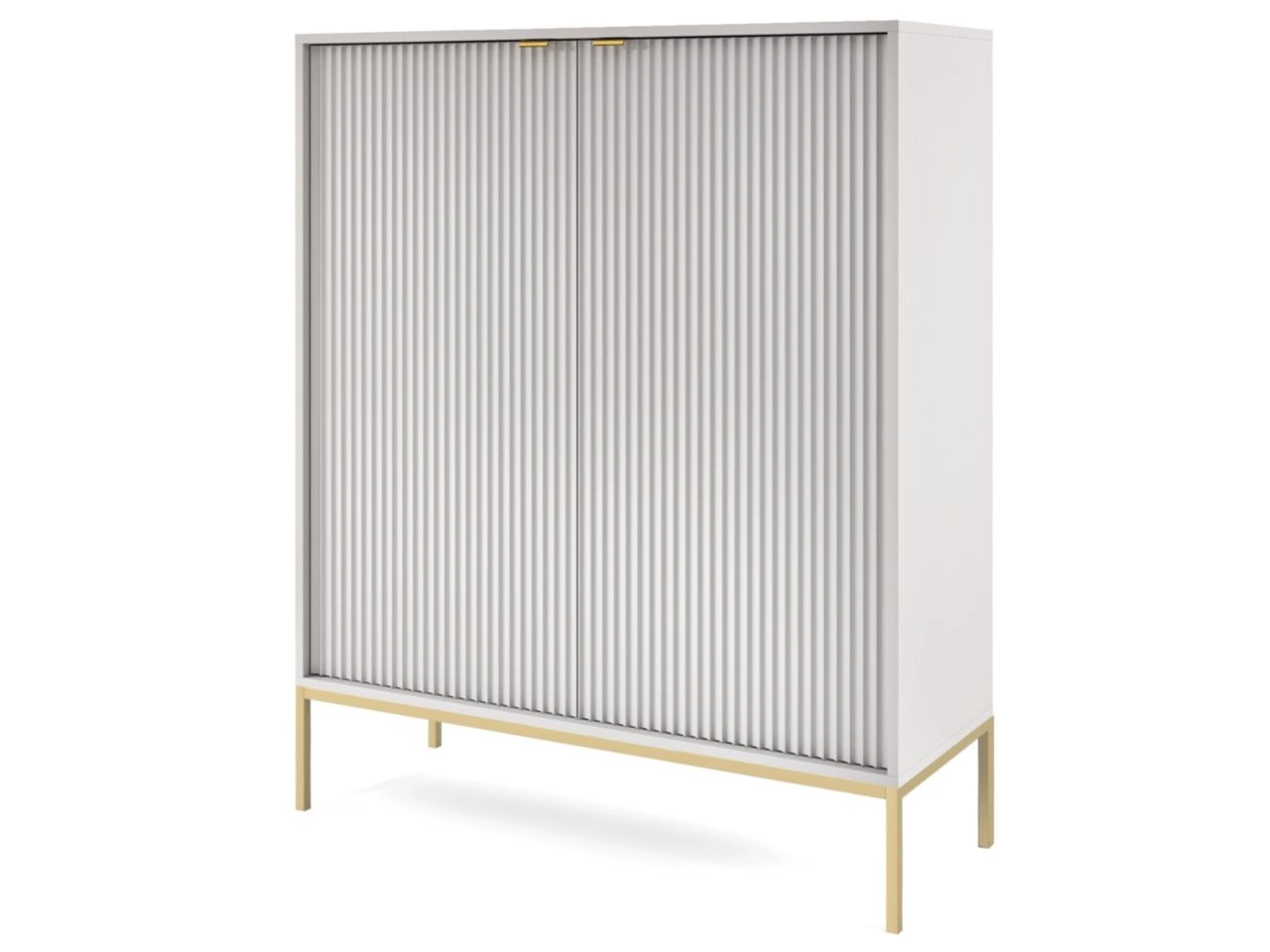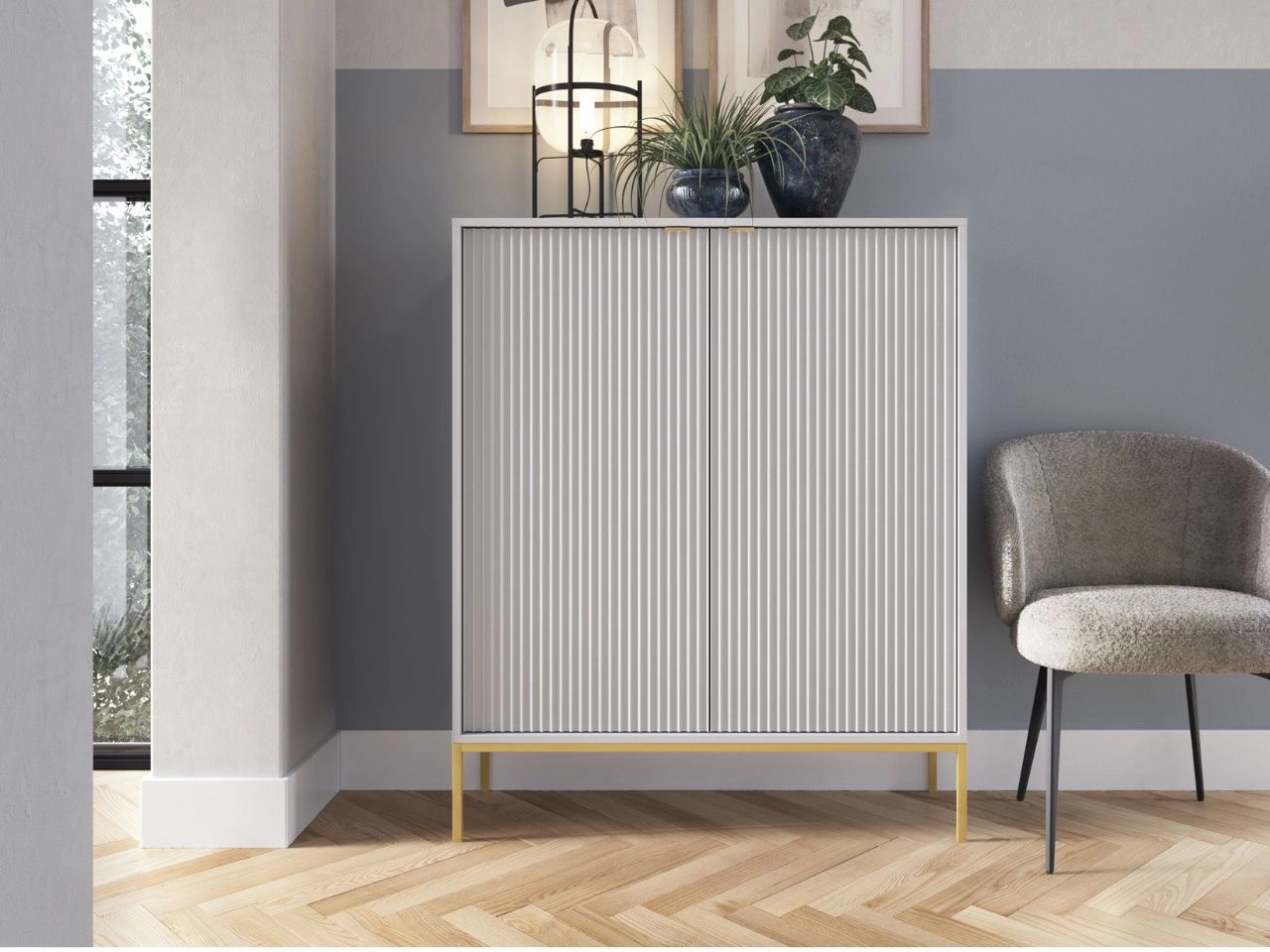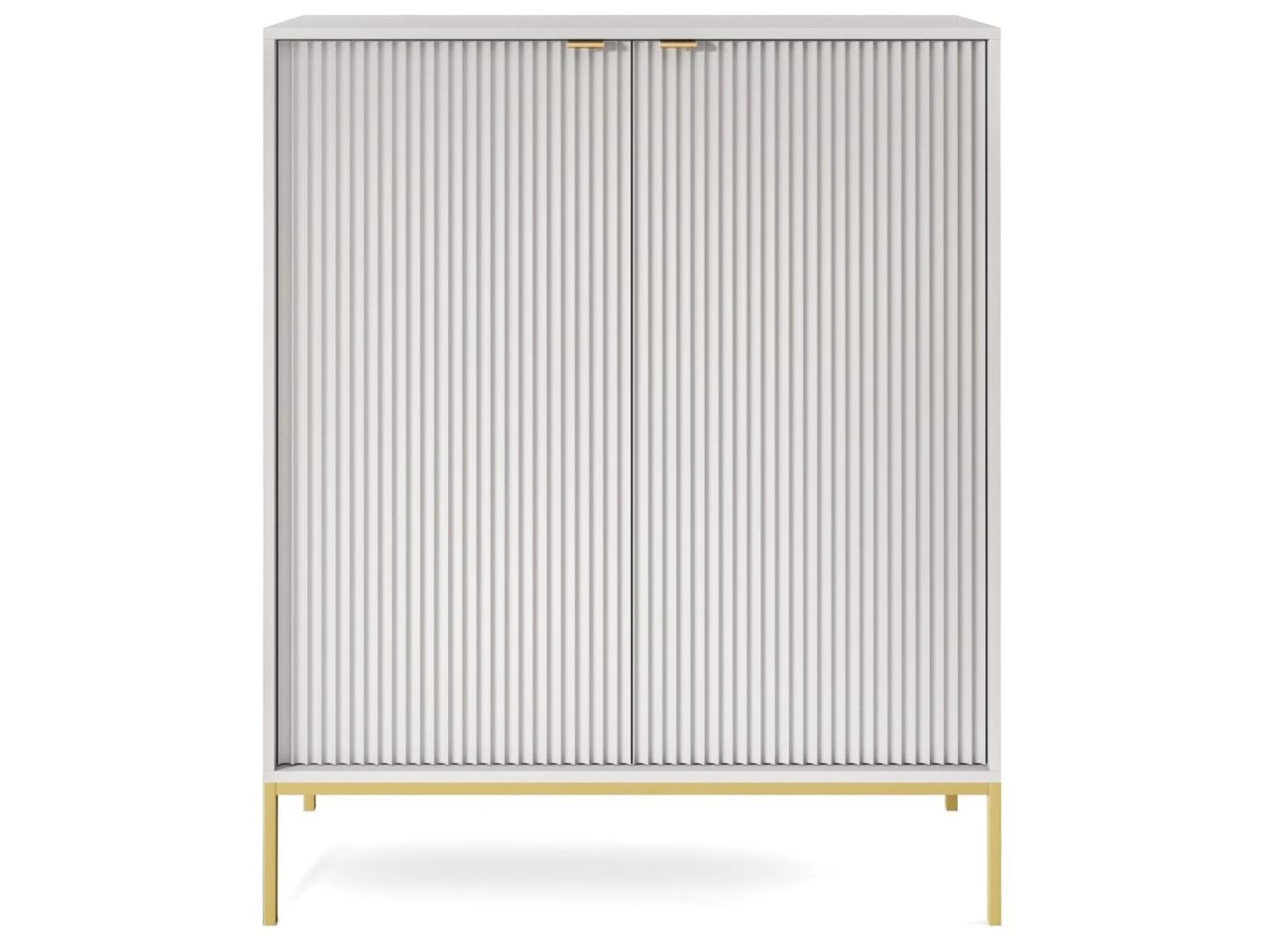 Das Modell ist mit zwei öffnenden Fronttüren ausgestattet, die praktischen Stauraum bieten und eine geordnete Aufbewahrung ermöglichen. Die charakteristische geriffelte Frontstruktur verleiht der Kommode einen stilvollen, markanten Ausdruck und setzt einen dekorativen Akzent, der sofort ins Auge fällt.