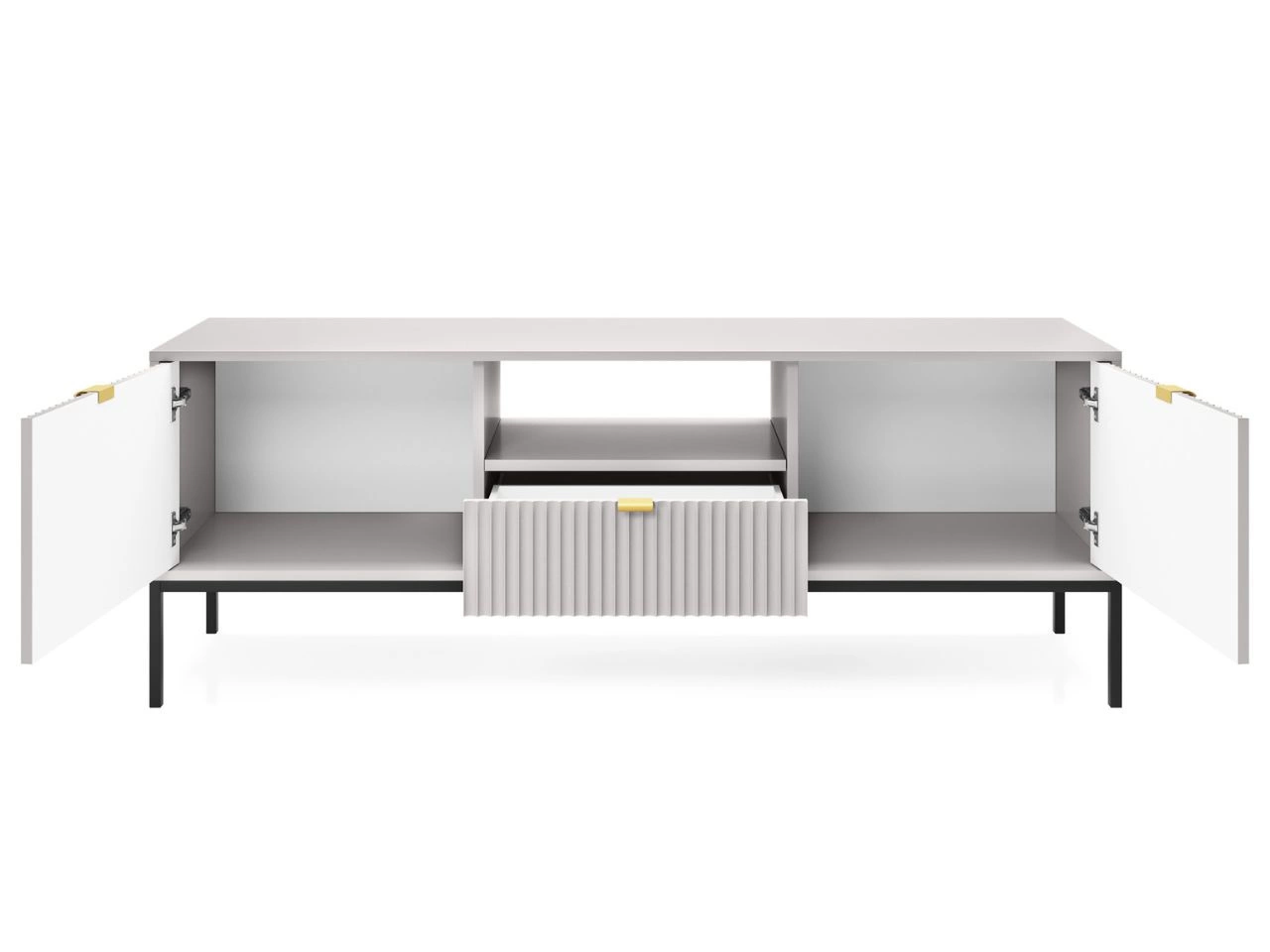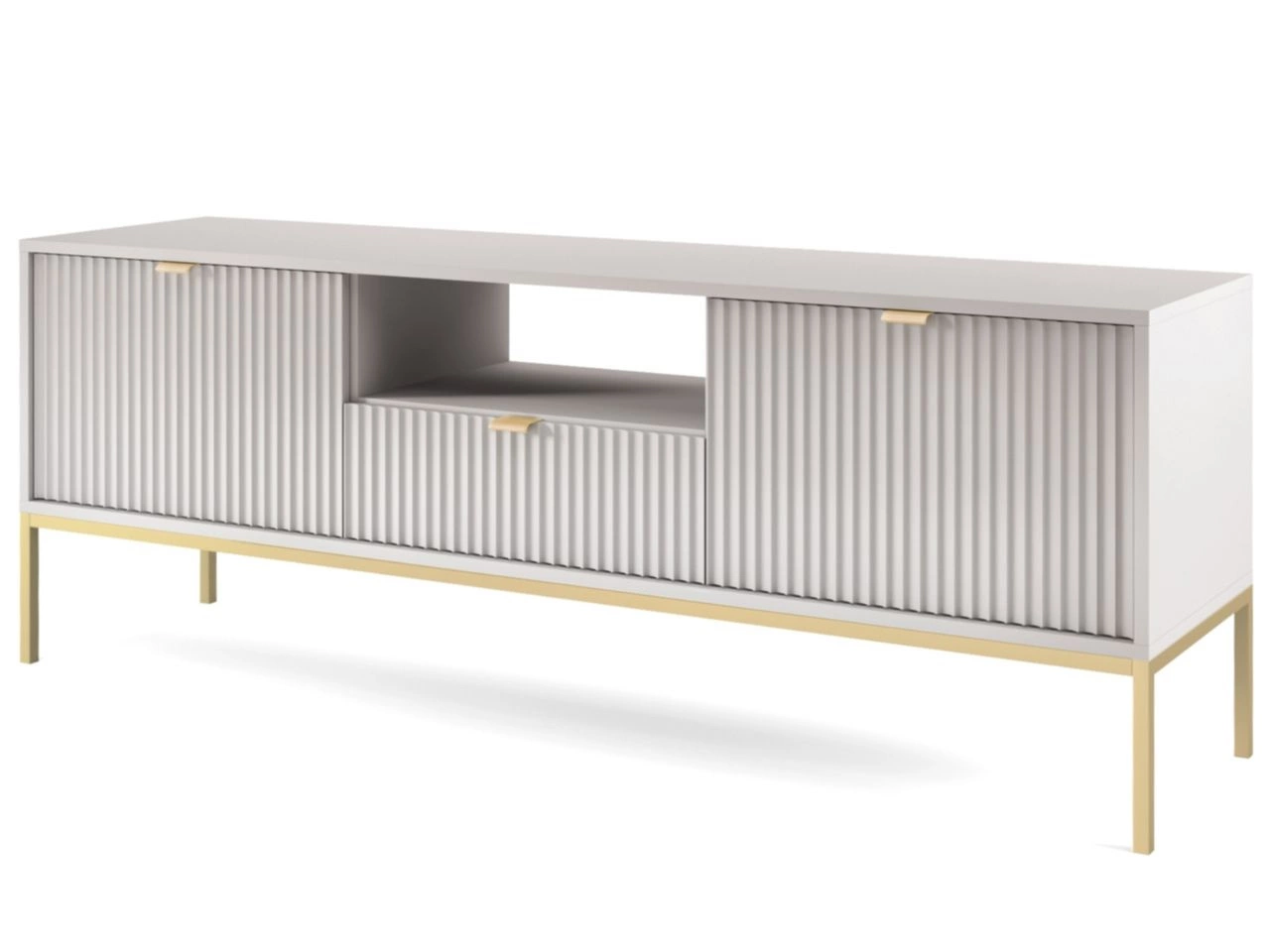 Die markanten geriffelten Fronten verleihen dem Möbelstück einen modernen, charaktervollen Look, während dezente Griffe das elegante Gesamtbild abrunden. Das TV-Lowboard Amber bereichert den Wohnraum optisch und sorgt zugleich für mehr Ordnung und eine bessere Organisation der täglichen Nutzung.