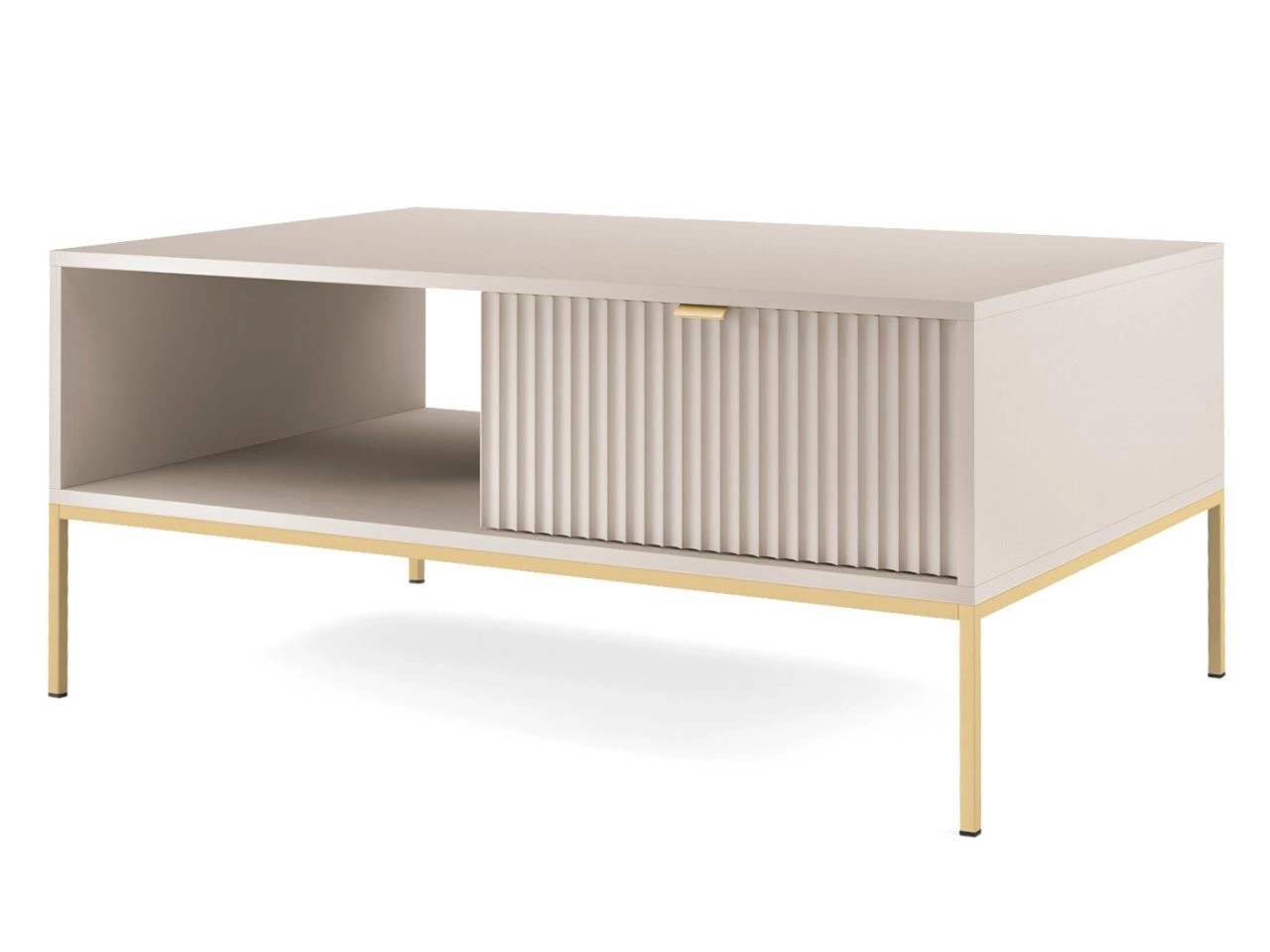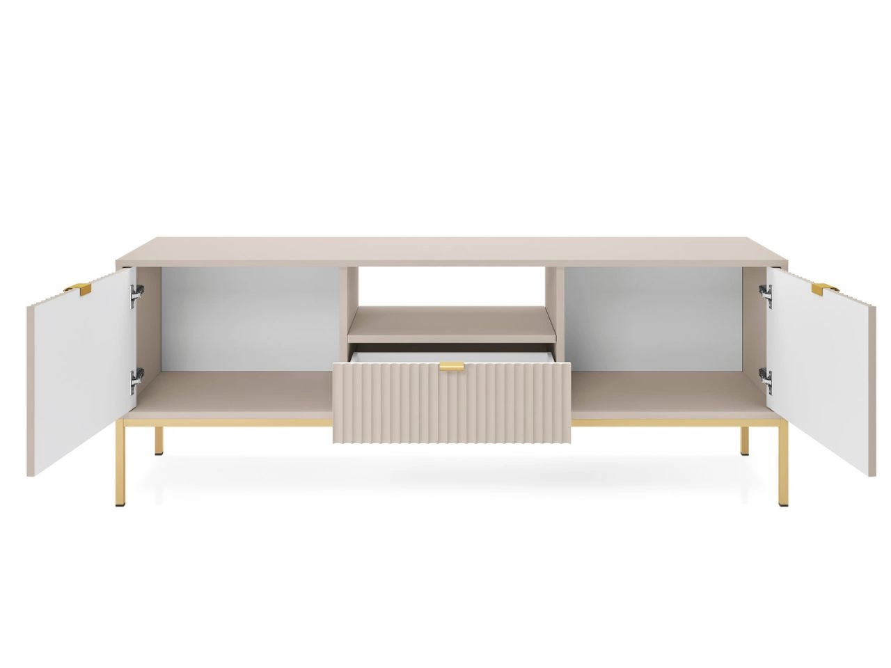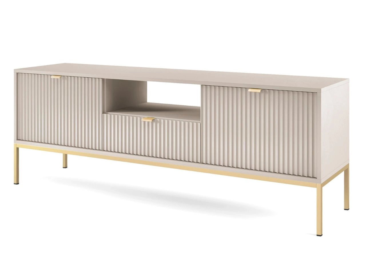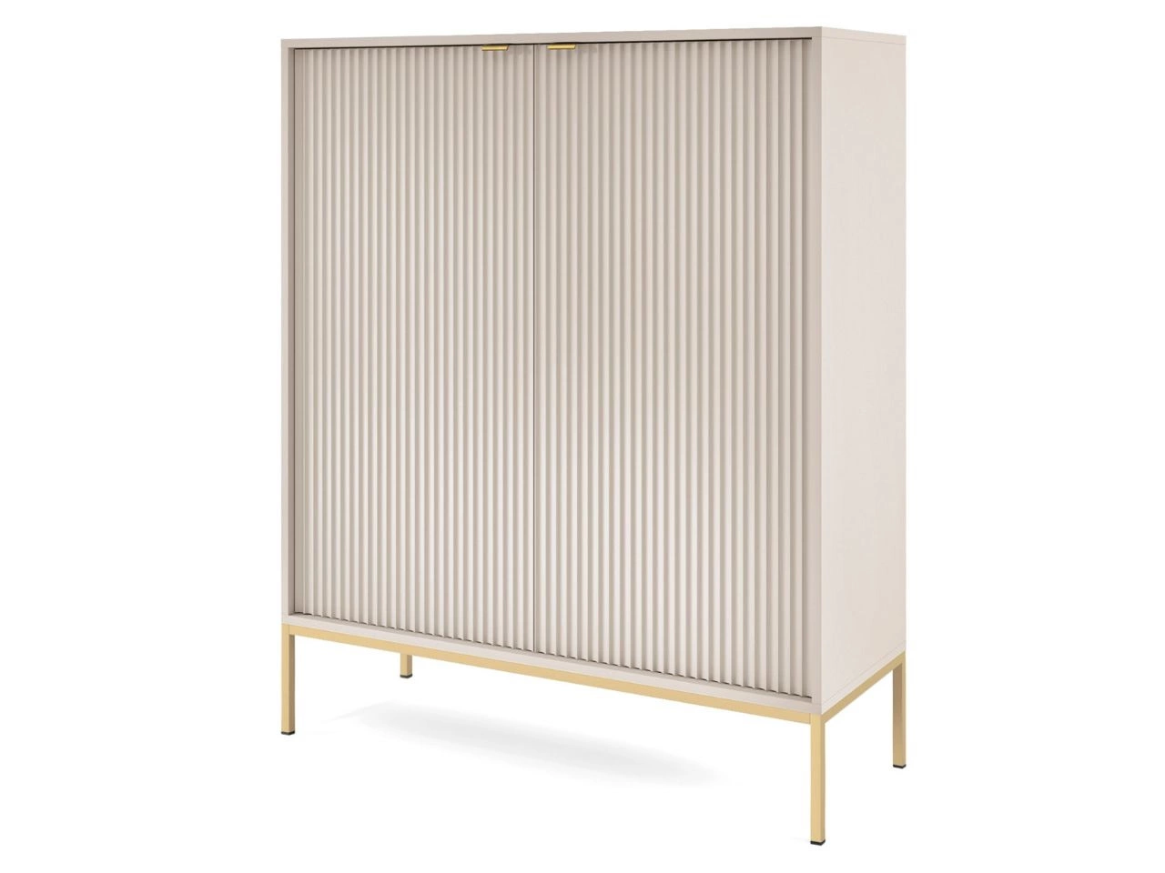 Das Wohnzimmerset Amber ist die ideale Wahl für alle, die einen eleganten, funktionalen und modern abgestimmten Wohnraum gestalten möchten. Die Kollektion präsentiert sich in einem dezenten, kaschmirfarbenen Ton, der dem Raum Leichtigkeit und zeitlose Ästhetik verleiht. Hochwertige laminierte Spanplatten sowie Fronten aus MDF mit 18 mm Stärke, ergänzt durch robuste ABS-Kanten, sorgen für Langlebigkeit, während durchdachte Details – wie geriffelte Fronten oder gebürstete goldene Griffe – den eleganten Charakter und den Bedienkomfort zusätzlich unterstreichen.