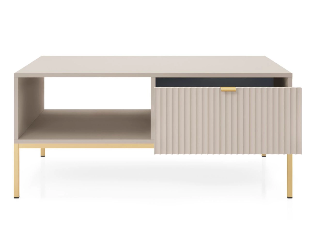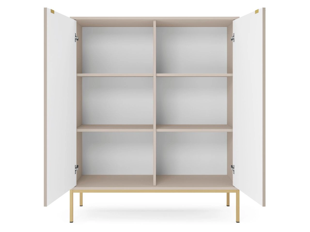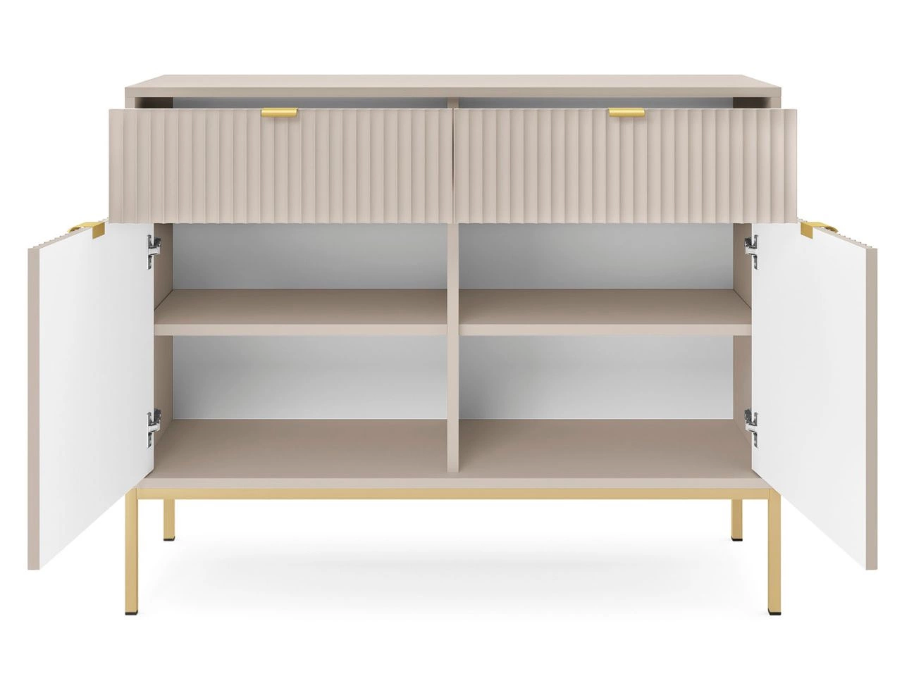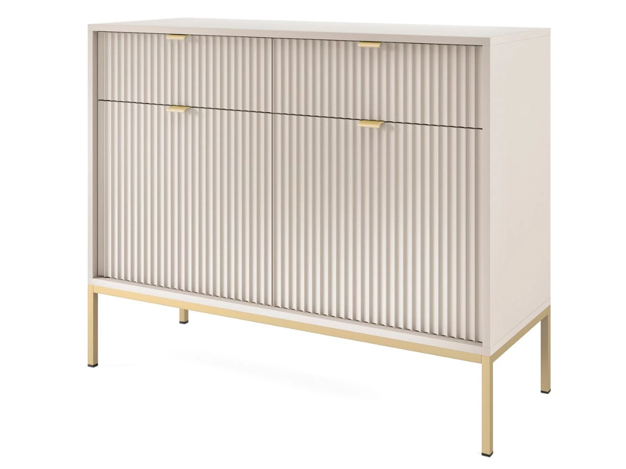 Das Wohnzimmerset Amber ist die ideale Wahl für alle, die einen eleganten, funktionalen und modern abgestimmten Wohnraum gestalten möchten. Die Kollektion präsentiert sich in einem dezenten, kaschmirfarbenen Ton, der dem Raum Leichtigkeit und zeitlose Ästhetik verleiht. Hochwertige laminierte Spanplatten sowie Fronten aus MDF mit 18 mm Stärke, ergänzt durch robuste ABS-Kanten, sorgen für Langlebigkeit, während durchdachte Details – wie geriffelte Fronten oder gebürstete goldene Griffe – den eleganten Charakter und den Bedienkomfort zusätzlich unterstreichen.