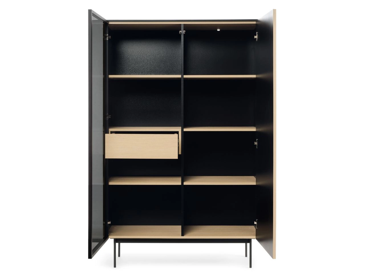 Die Vitrine Auroé verfügt über ein griffloses Push-to-Open-System – einfach drücken zum Öffnen. Dieses System kommt sowohl bei den Türen als auch bei der Schublade zum Einsatz. Der Korpus besteht aus einer hochwertigen laminierten Möbelplatte, deren Kanten mit einer ABS-Umleimung geschützt sind, um feine Kratzer, mechanische Beschädigungen und das Eindringen von Feuchtigkeit zu minimieren. Getragen wird das Möbel von schwarzen Metallfüßen, die der Silhouette Leichtigkeit und Eleganz verleihen.
