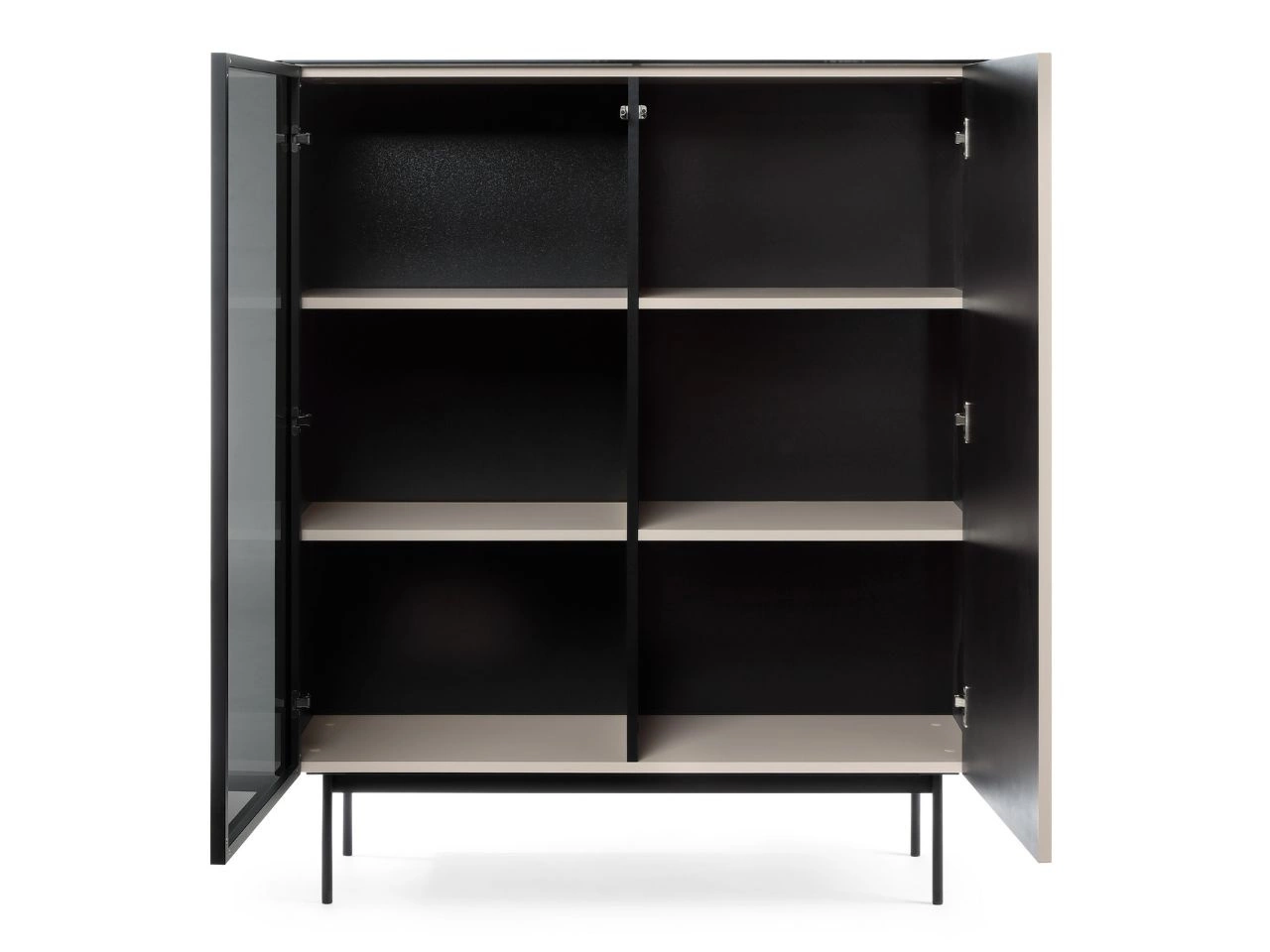 Vitrine Auroé ist mit einem grifflosen Push-to-Open-System ausgestattet – leichtes Antippen genügt, um die Türen zu öffnen. Der Korpus wird aus hochwertiger, laminierter Möbelplatte gefertigt, deren Kanten mit einer ABS-Kante geschützt sind. Diese Verarbeitung erhöht die Widerstandsfähigkeit gegen kleine Kratzer und mechanische Beschädigungen und reduziert das Eindringen von Feuchtigkeit. Die Vitrine Auroé steht auf schwarzen Metallfüßen und wirkt dadurch besonders leicht und modern.