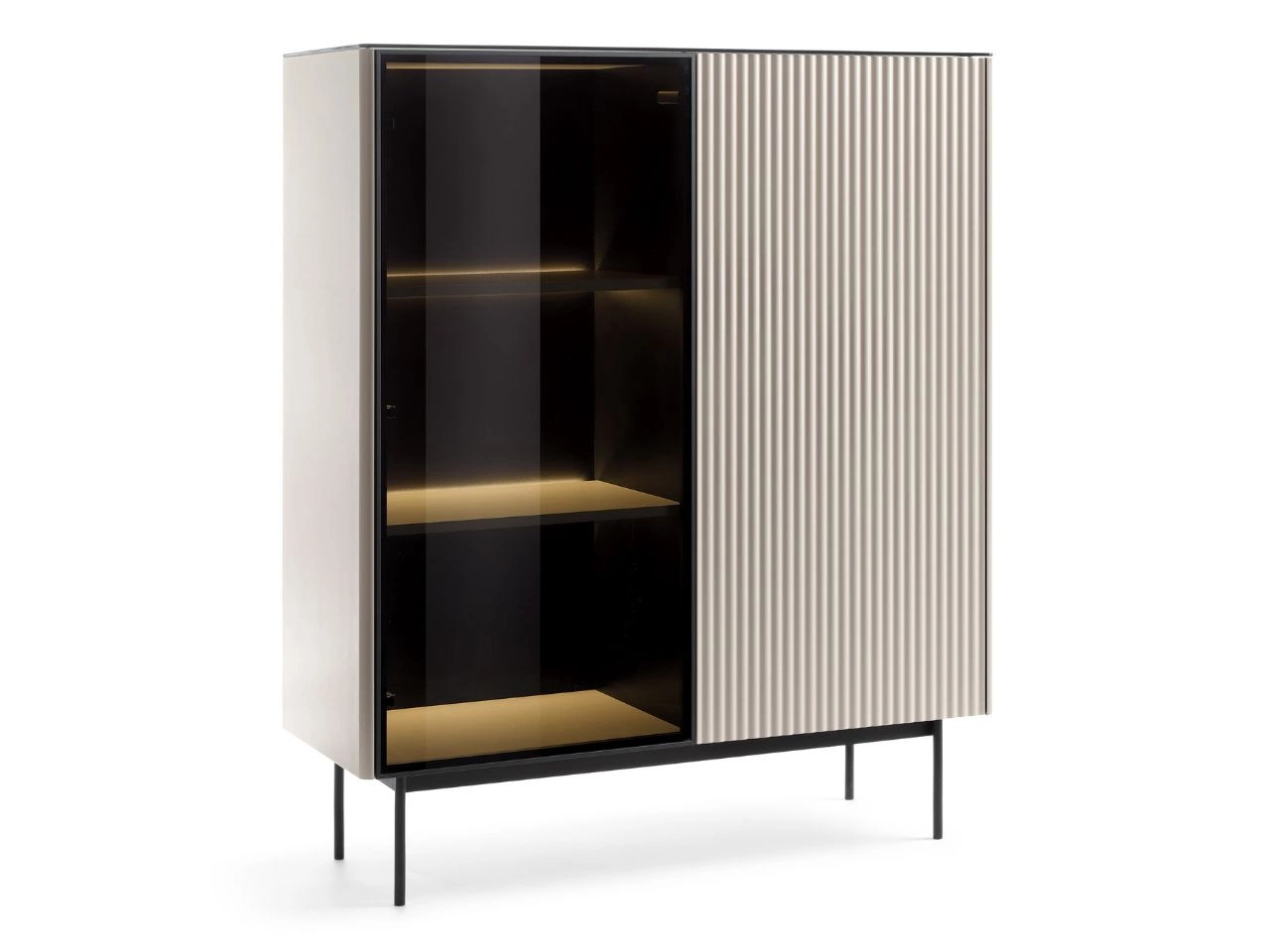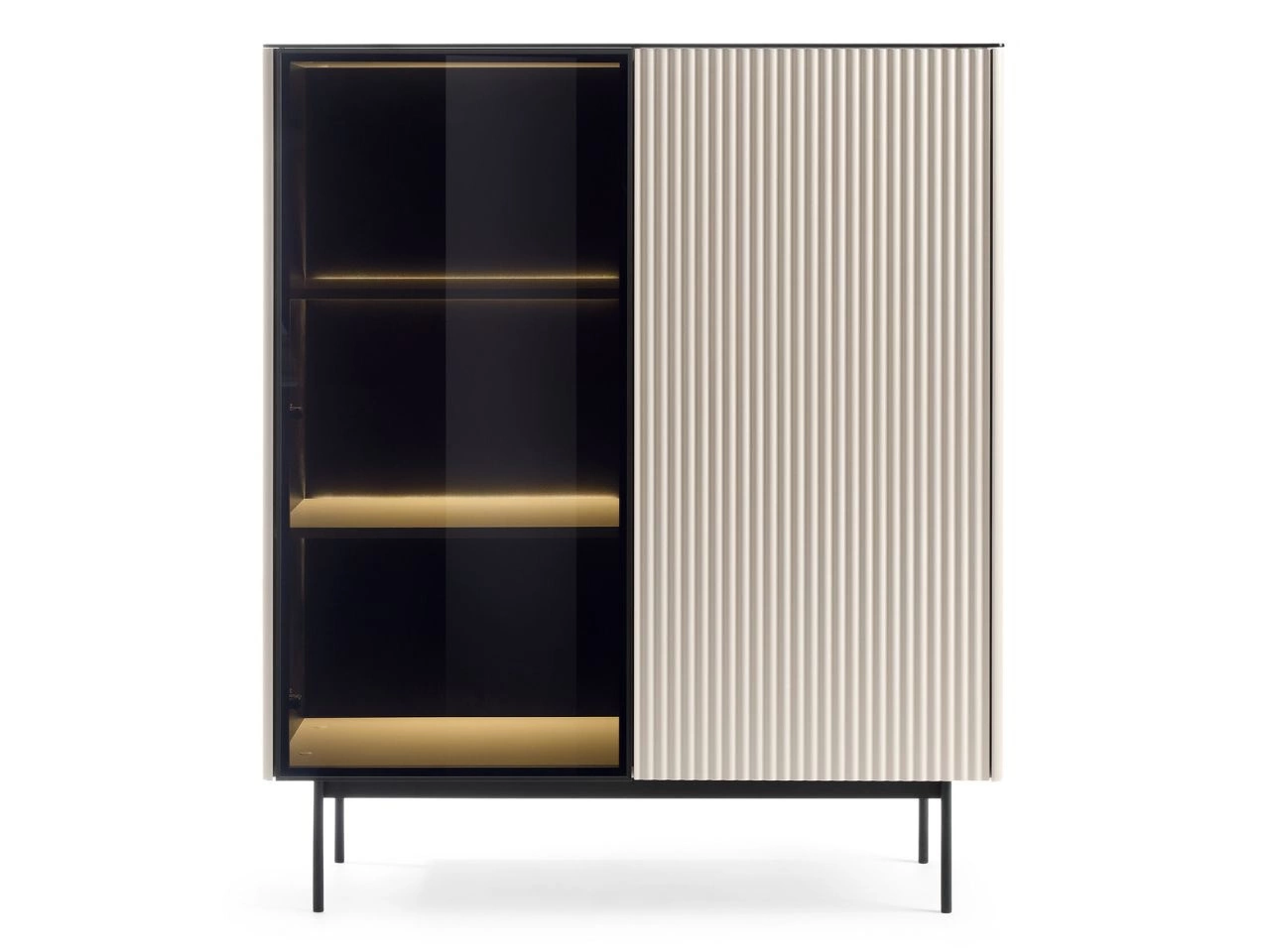 Die zweitürige Vitrine Auroé besticht vor allem durch ihre außergewöhnliche Frontgestaltung: Auf der rechten Tür fällt sofort die senkrechte Riffelstruktur ins Auge, während die linke Tür mit einer Vitrinenfront aus getöntem Sicherheitsglas versehen ist. Das Innere des Glasfachs wird zusätzlich durch eine LED-Beleuchtung (Netzbetrieb) stimmungsvoll hervorgehoben.
