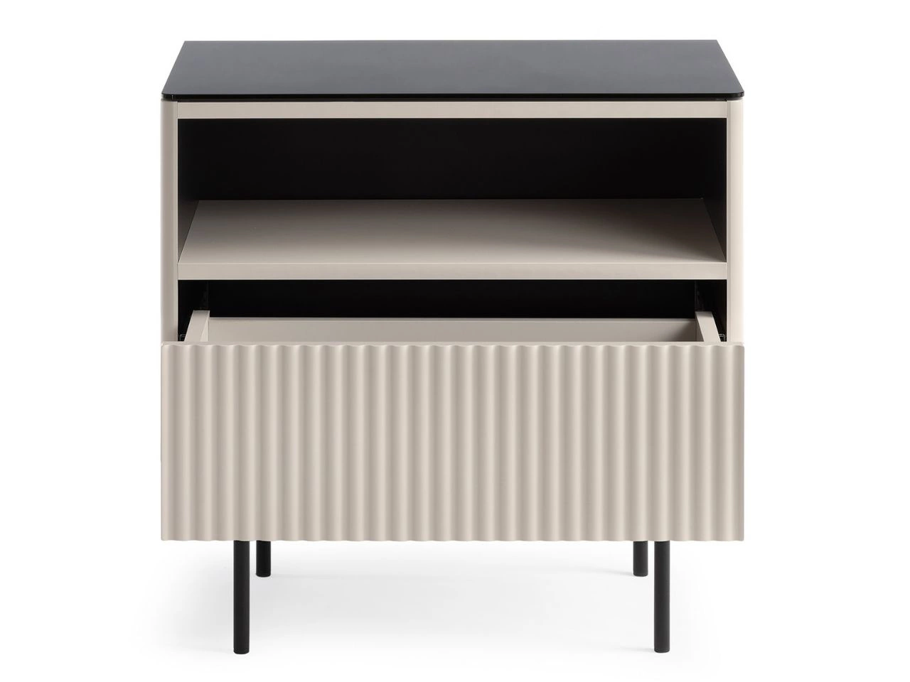 Der Nachttisch Auroé verfügt über eine Schublade mit geriffelter Front sowie ein offenes Fach mit integrierter LED-Beleuchtung. Die Schublade bewegt sich auf Kugelführungen mit Vollauszug, was einen komfortablen Zugriff ermöglicht. Der Korpus ist aus robuster, laminierter Möbelplatte gefertigt, deren Kanten durch eine ABS-Kante geschützt sind. Diese schützt vor kleinen Kratzern, mechanischen Beschädigungen und dem Eindringen von Feuchtigkeit.