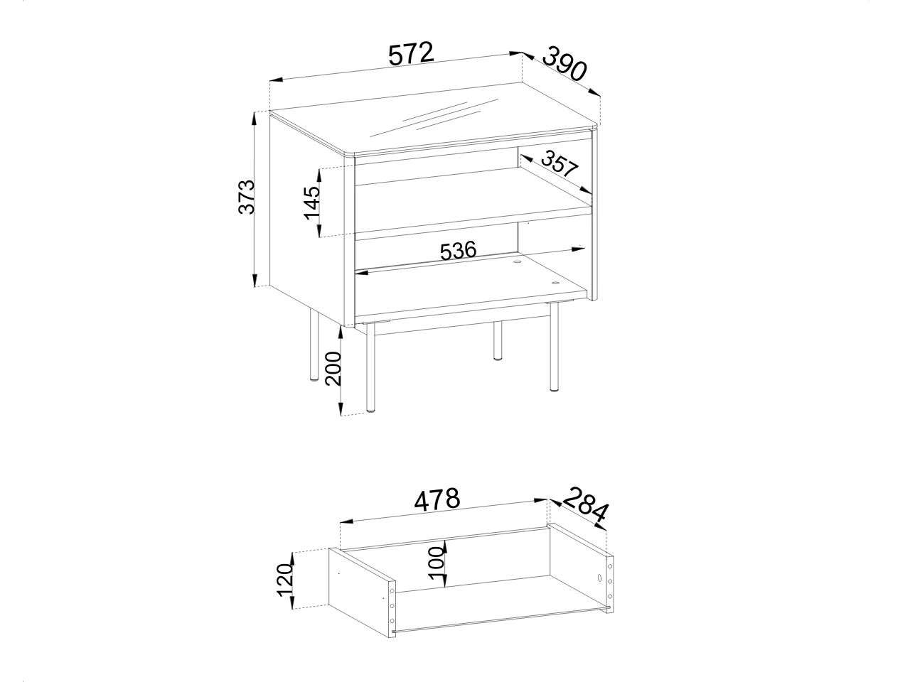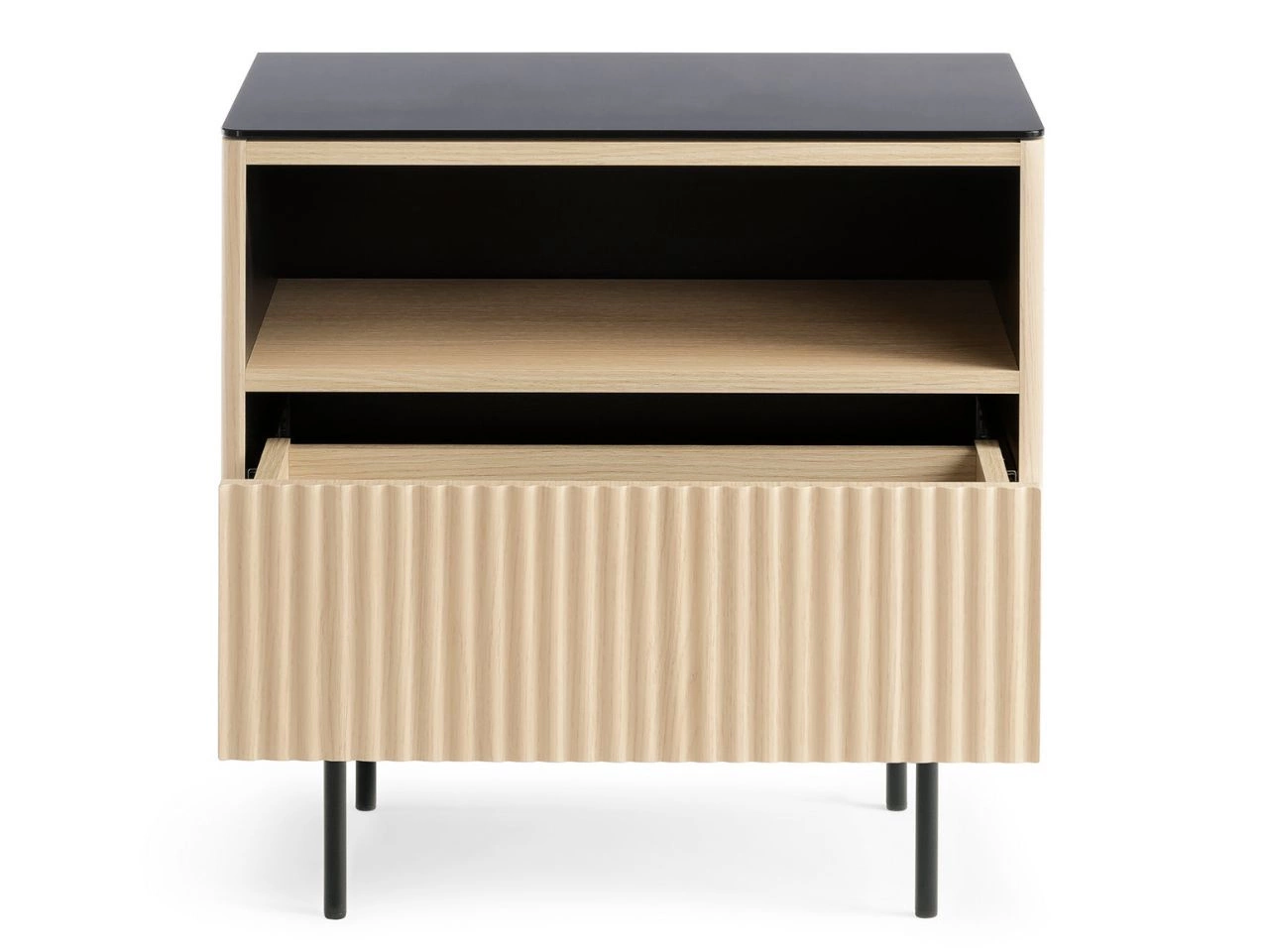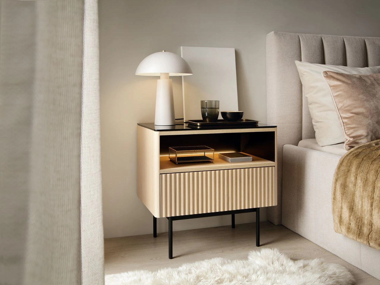 Der Nachttisch Auroé verfügt über eine Schublade mit geriffelter Front sowie ein offenes Fach mit integrierter LED-Beleuchtung. Die Schublade bewegt sich auf Kugelführungen mit Vollauszug, was einen komfortablen Zugriff ermöglicht. Der Korpus ist aus robuster, laminierter Möbelplatte gefertigt, deren Kanten durch eine ABS-Kante geschützt sind. Diese schützt vor kleinen Kratzern, mechanischen Beschädigungen und dem Eindringen von Feuchtigkeit.
