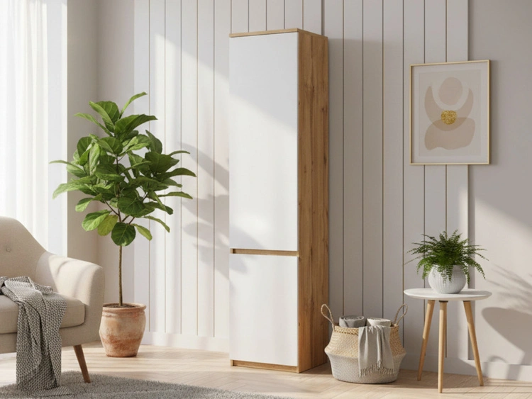 Der Kleiderschrank Arcadia ist ein schlankes und praktisches Möbelstück, das für moderne, gut organisierte Wohnräume entworfen wurde. Die klare Form sowie die glatten, weißen Fronten in Kombination mit dem Korpus in Eiche Wotan verleihen dem Schrank einen warmen, natürlichen Charakter, der hervorragend zu skandinavischen, minimalistischen und zeitgenössischen Einrichtungsstilen passt. Dank seiner kompakten Form eignet er sich ideal als schmaler Jugendkleiderschrank für das Zimmer eines Teenagers.