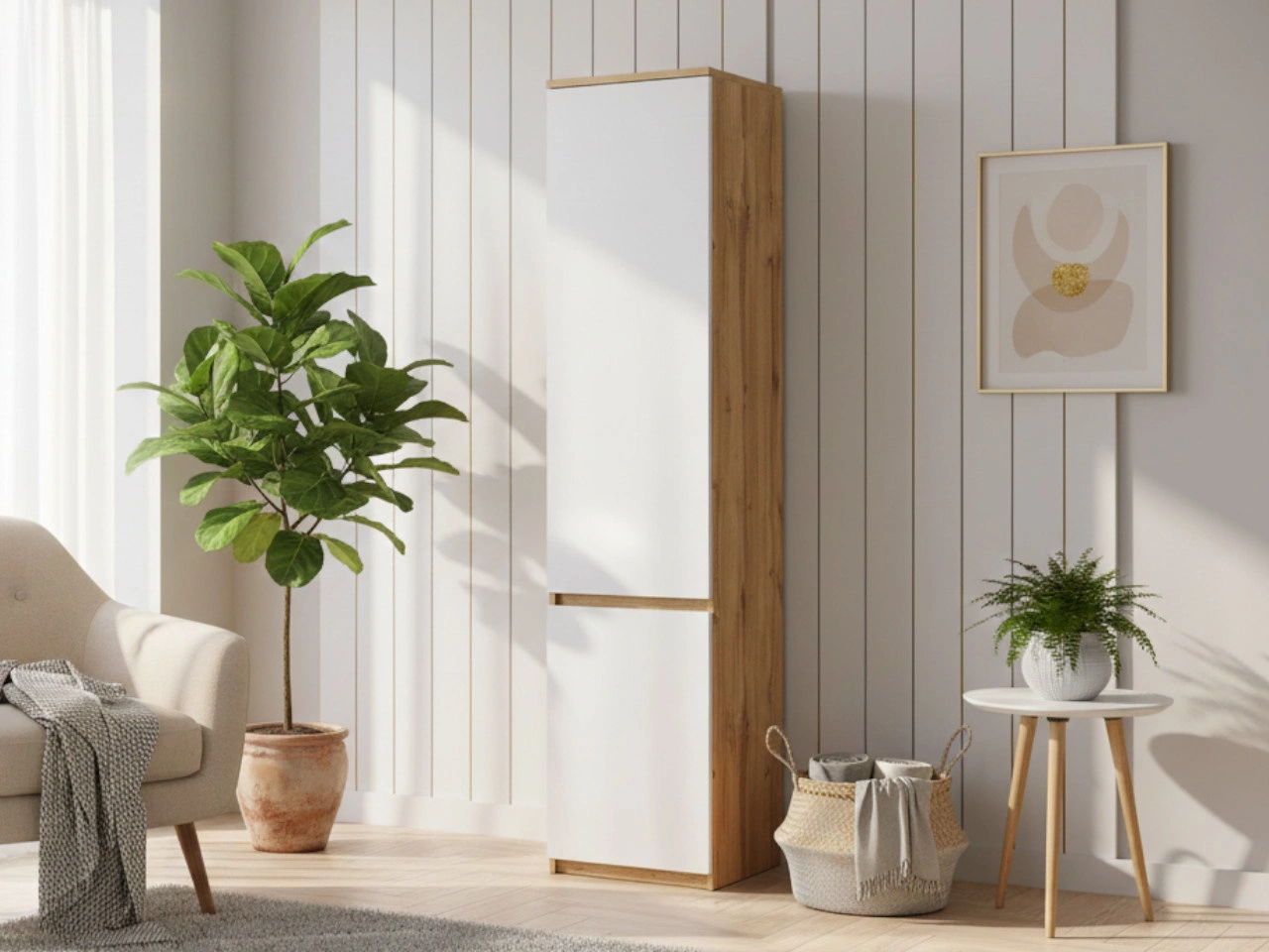 Die Konstruktion besteht aus zwei separat schließbaren Bereichen – einem oberen und einem unteren Teil – was die Organisation erleichtert und Ordnung im Alltag schafft. Im Inneren befindet sich ein funktionales Regalsystem, das ausreichend Platz für Kleidung, Accessoires, Heimtextilien oder kleine Alltagsgegenstände bietet. Die durchdachte Innenaufteilung macht den Schrank zu einer idealen Lösung als Kleiderschrank fürs Jugendzimmer, der seine schmale Form optimal ausnutzt.