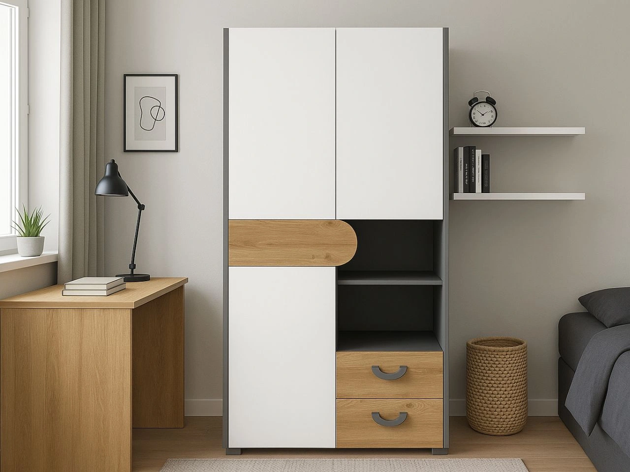 Kleiderschrank mit Schwingtüren für ein Teenagerzimmer 80 Casa Nash Eiche, Weiß, Grau
