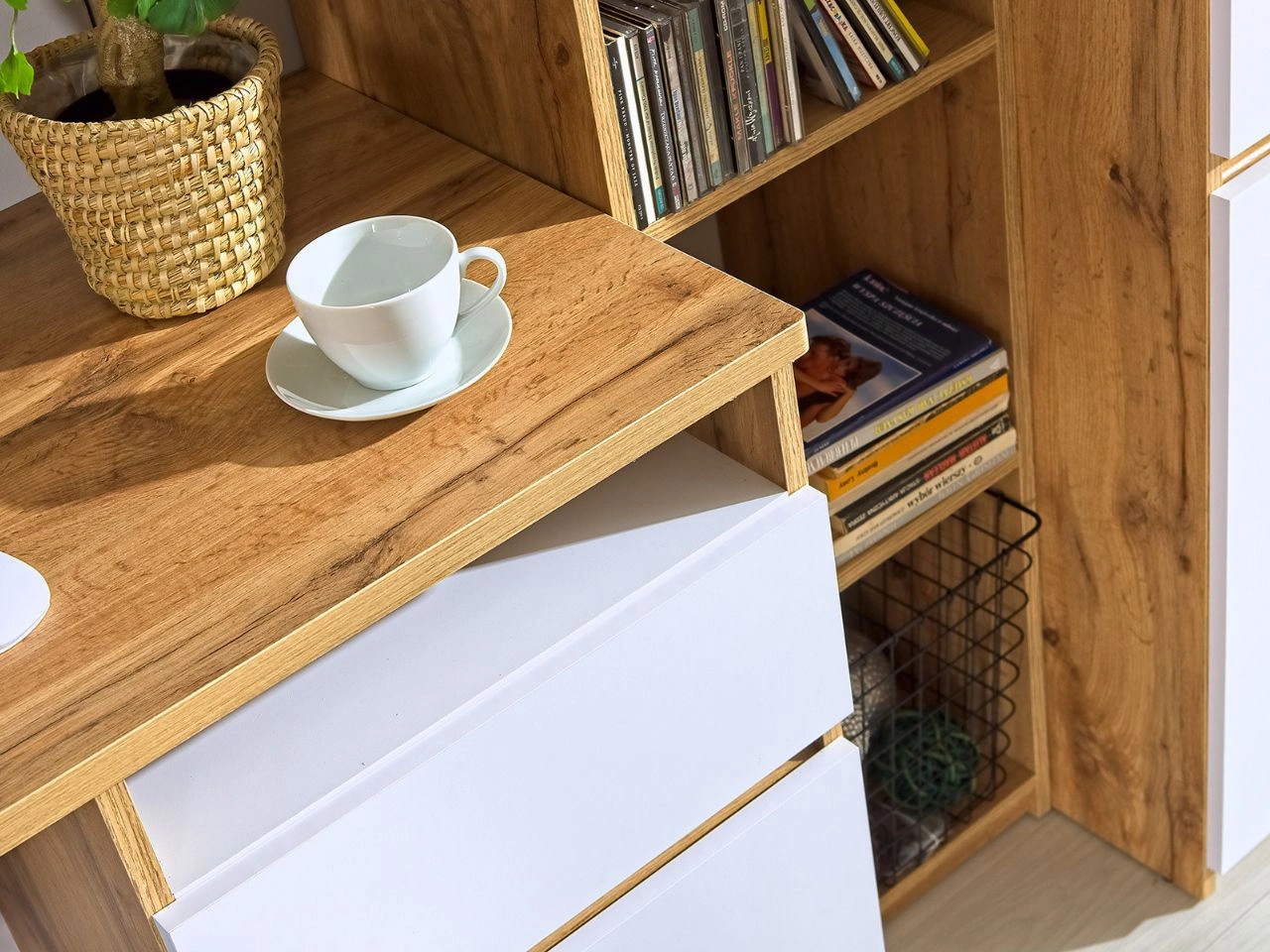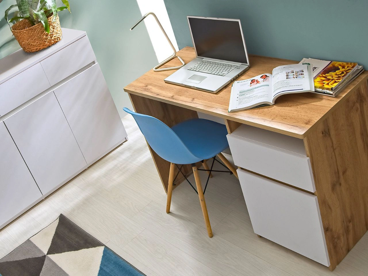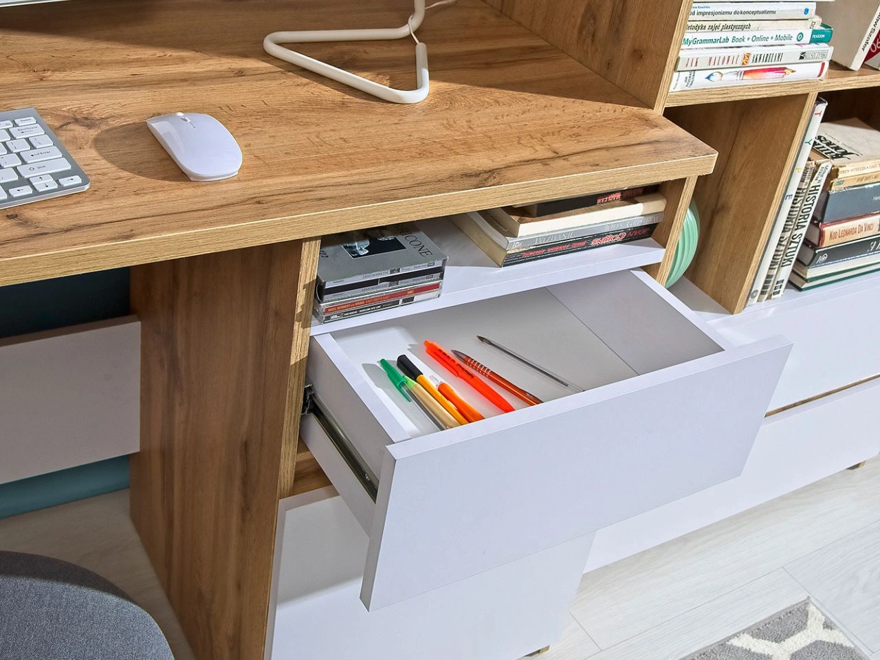 Der Jugend-Schreibtisch Arcadia ist der ideale Arbeitsplatz für Schule, Computerarbeit und kreative Aktivitäten. Das moderne Design in der Kombination aus weißen Fronten und einem Korpus in Eiche Wotan bringt Frische, Wärme und eine natürliche, gemütliche Atmosphäre ins Jugendzimmer. Dieser Look passt perfekt zu skandinavischen, modernen und zeitgemäßen Einrichtungskonzepten.