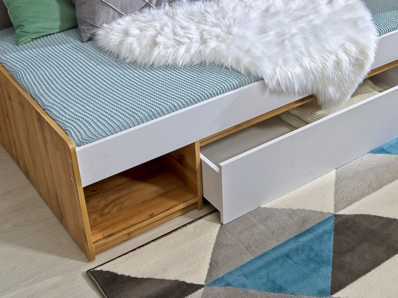 Arcadia bietet nicht nur eine bequeme Schlaffläche, sondern sorgt auch für eine optimale Organisation im Jugendzimmer. Unter dem Bettrahmen befinden sich auf beiden Seiten praktische offene Fächer, die sich perfekt für Bücher, Deko, Körbe oder alltägliche Kleinigkeiten eignen – alles bleibt jederzeit griffbereit. In der Mitte befindet sich eine große, geräumige Schublade für Bettwäsche, ideal als zusätzlicher Stauraum in kompakten Räumen.