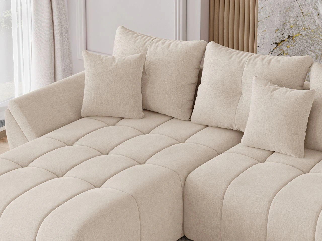 Die Sitzfläche besteht aus einer Kombination aus Wellenfedern und hochelastischem T30-Polyurethanschaum, was für hervorragenden Sitzkomfort, Stabilität und Langlebigkeit sorgt. Die Rückenlehne wird von neun Kissen gebildet – fünf großen und vier kleineren – die für ein angenehmes, weiches Anlehnen sorgen. Eine besonders praktische Funktion des Decor U Ecksofas ist die integrierte Schlaffunktion, die eine große und bequeme Liegefläche von 133 × 335 cm bietet. Das Ausziehen funktioniert dank des DL-Mechanismus schnell und mühelos. Zusätzlich steht ein geräumiger Bettkasten zur Verfügung, ideal zur Aufbewahrung von Bettwäsche.