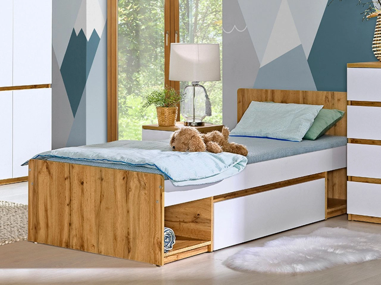 Der Ruhebereich besteht aus einem bequemen Jugendbett mit einer großen, ausziehbaren Schublade, die sich perfekt zur Aufbewahrung von Bettwäsche, Decken oder saisonalen Textilien eignet. An den Seiten des Bettes befinden sich offene Ablagefächer, ideal für Bücher, Dekorationen oder kleine Alltagsgegenstände, die griffbereit sein sollen. Ergänzt wird dieser Bereich durch einen Nachtisch mit zwei Schubladen, der zusätzlichen, leicht zugänglichen Stauraum bietet. Ein weiteres Wandregal über dem Bett ermöglicht die Nutzung des Wandbereichs für Pflanzen, Deko oder persönliche Erinnerungsstücke.