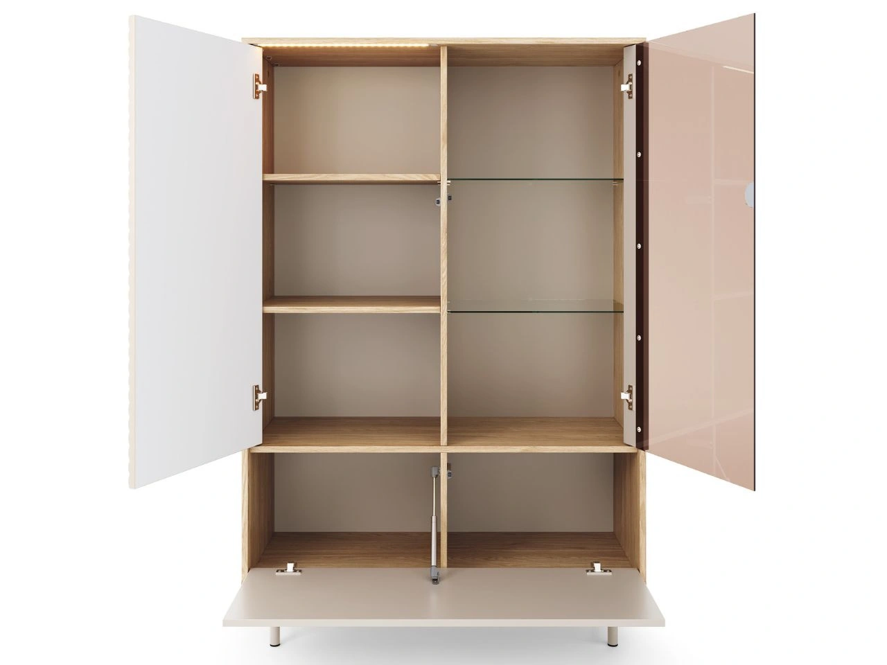 Im unteren Teil des Möbels befindet sich eine nach unten öffnende Klappe mit Gasdruckfeder, die ein komfortables Öffnen und einen bequemen Zugriff auf zusätzlichen Stauraum ermöglicht. Das in der gesamten Vitrine verwendete Push-to-Open-System sorgt für eine komplett glatte, grifflose Front und betont die moderne Linienführung des Designs.