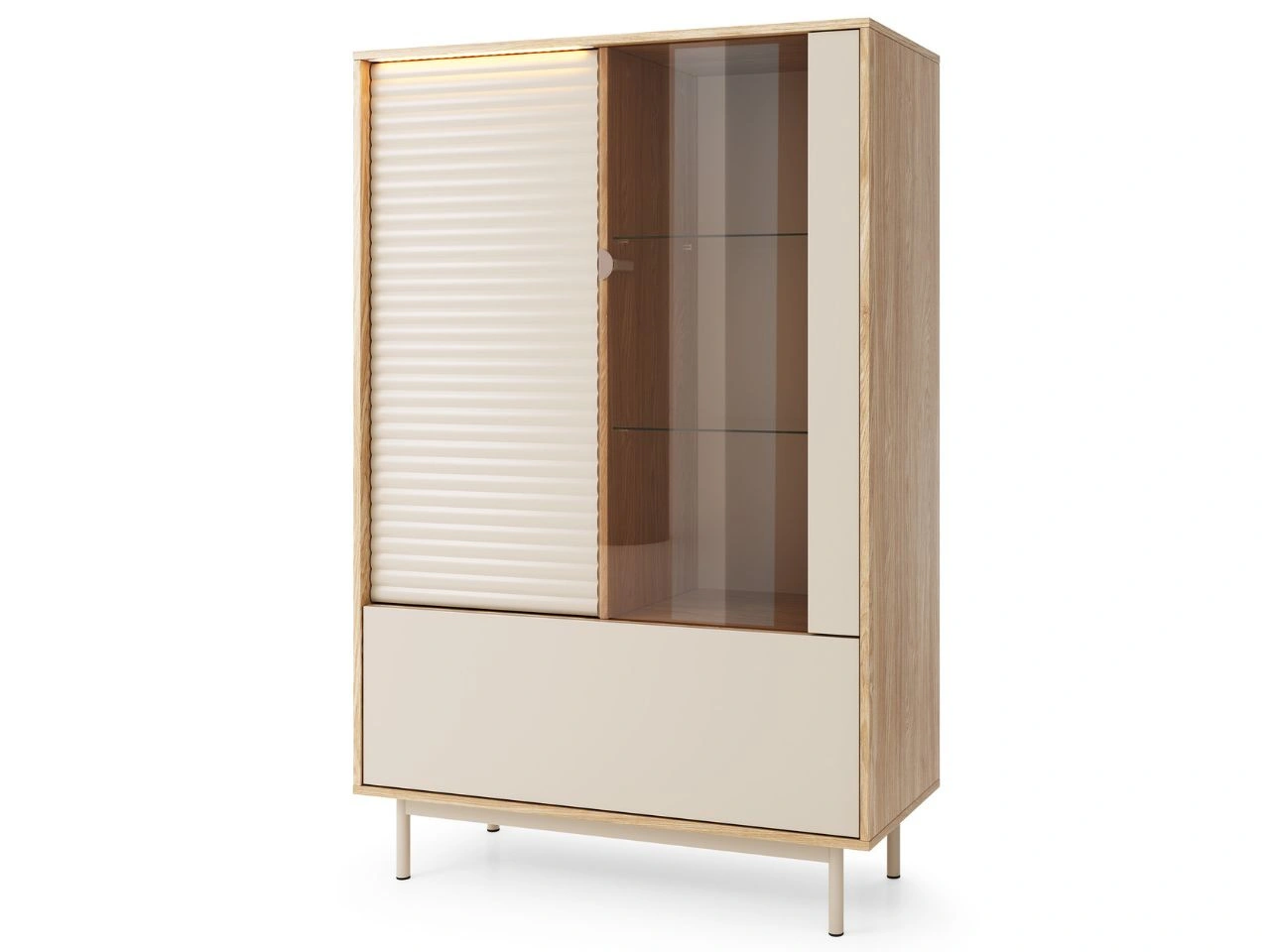 Die Vitrine Rapallo wurde für Räume geschaffen, in denen Harmonie, Leichtigkeit und ein hoher ästhetischer Anspruch im Vordergrund stehen. Dieses Möbelstück verbindet modernen Minimalismus mit subtiler Eleganz und setzt in jedem Interieur einen besonderen Akzent. Die charakteristische, fein gerillte Front im Farbton Kaschmir verleiht dem Design Tiefe und Ausdruck, während die elegante Verglasung aus gehärtetem Glas den luxuriösen Charakter der gesamten Kollektion unterstreicht. Die Kombination dieser Materialien sorgt für einen ruhigen, stilvollen Effekt, der sich ideal für das Wohnzimmer, den Essbereich oder eine gemütliche Relaxzone eignet.