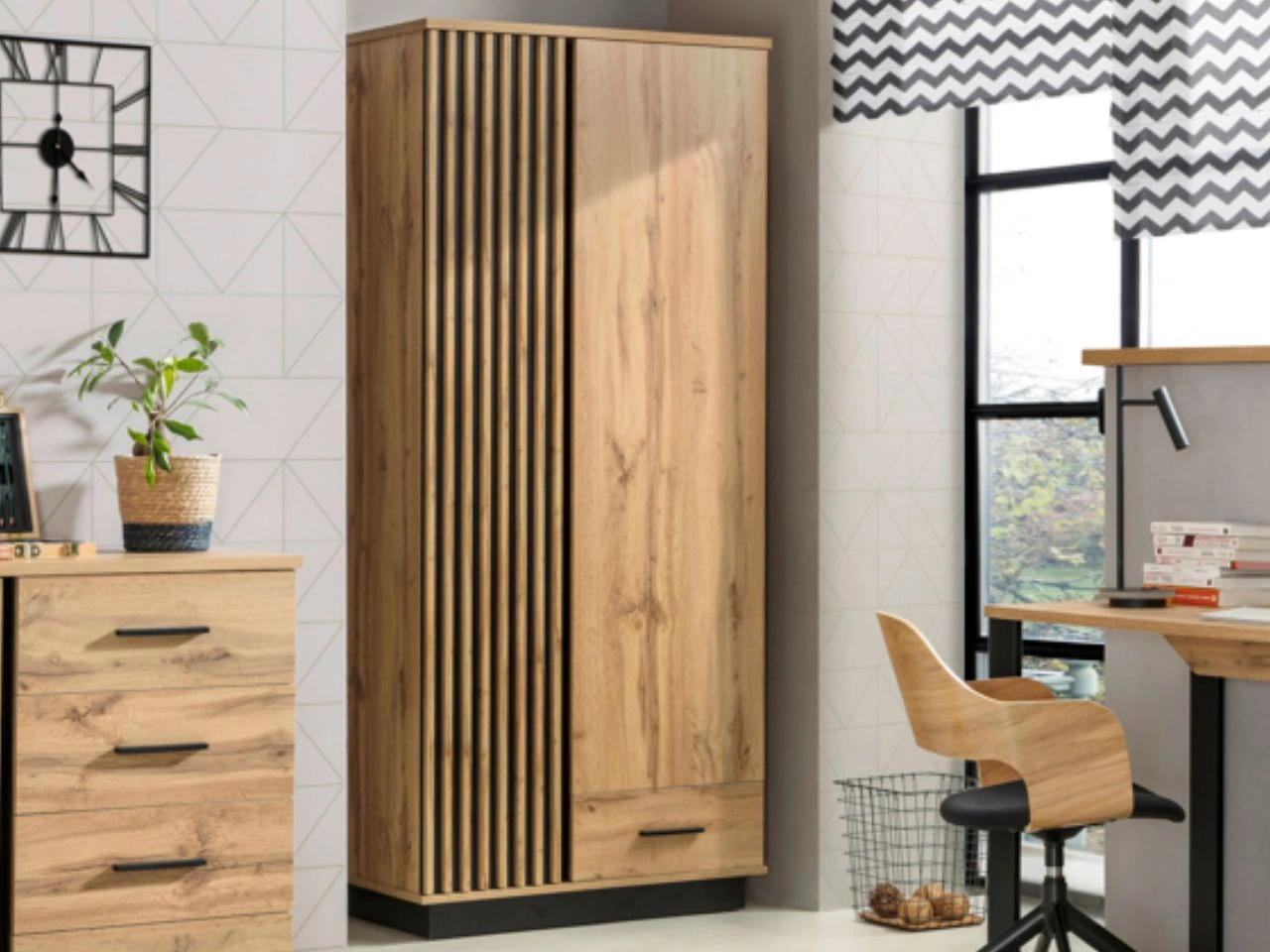 Der Lavore Zweitürenschrank ist ein modernes Beispiel dafür, wie Schränke mit Drehtüren Funktionalität, Ästhetik und zeitloses Design verbinden können. Der Kleiderschrank mit Drehtüren überzeugt durch seinen industriell inspirierten Look, der durch vertikale Zierlamellen auf den Fronten unterstrichen wird. Diese verleihen der öffnenden Schranklösung einen markanten, eleganten Akzent und machen sie zu einem Highlight in jeder Einrichtung.