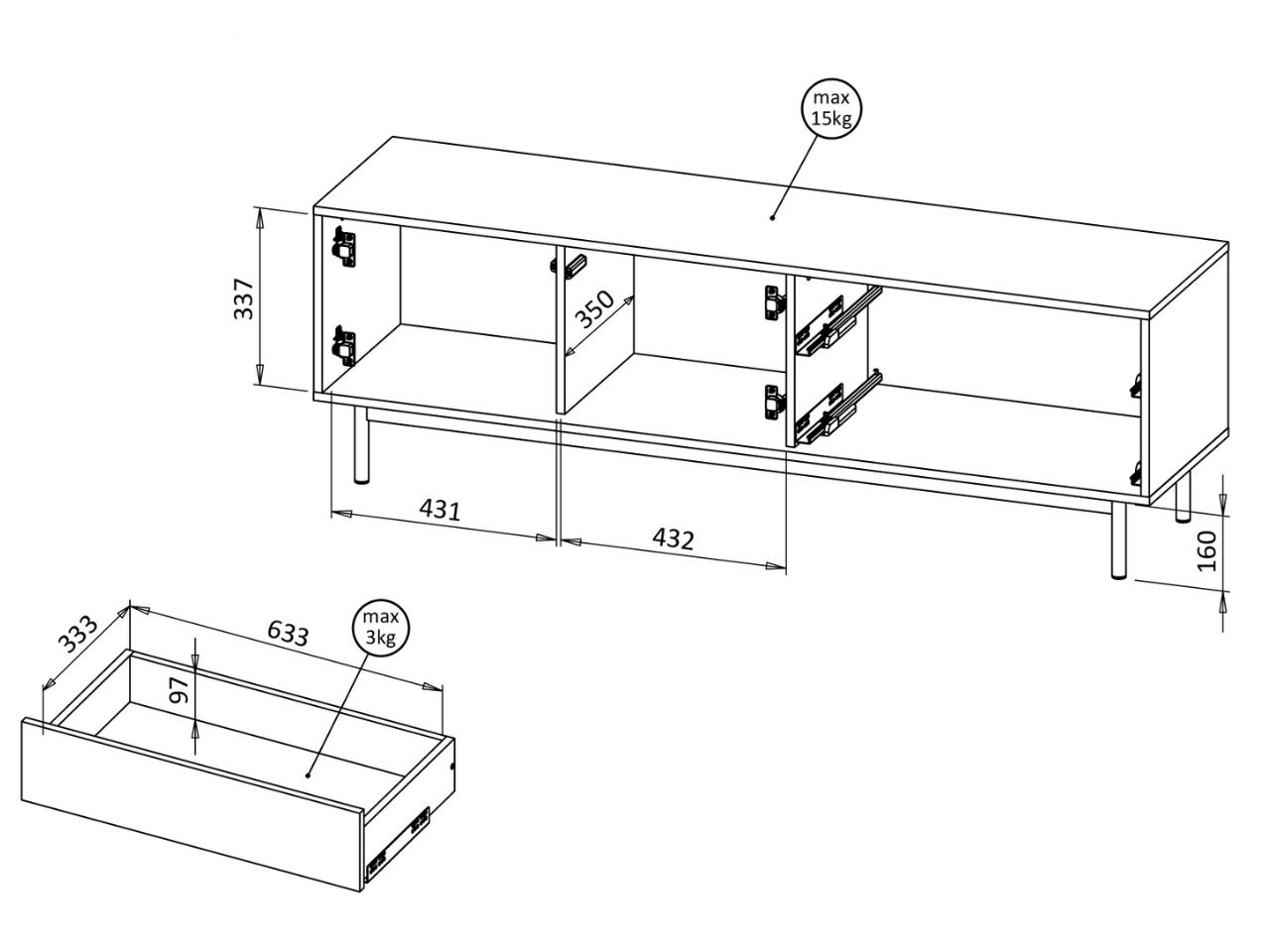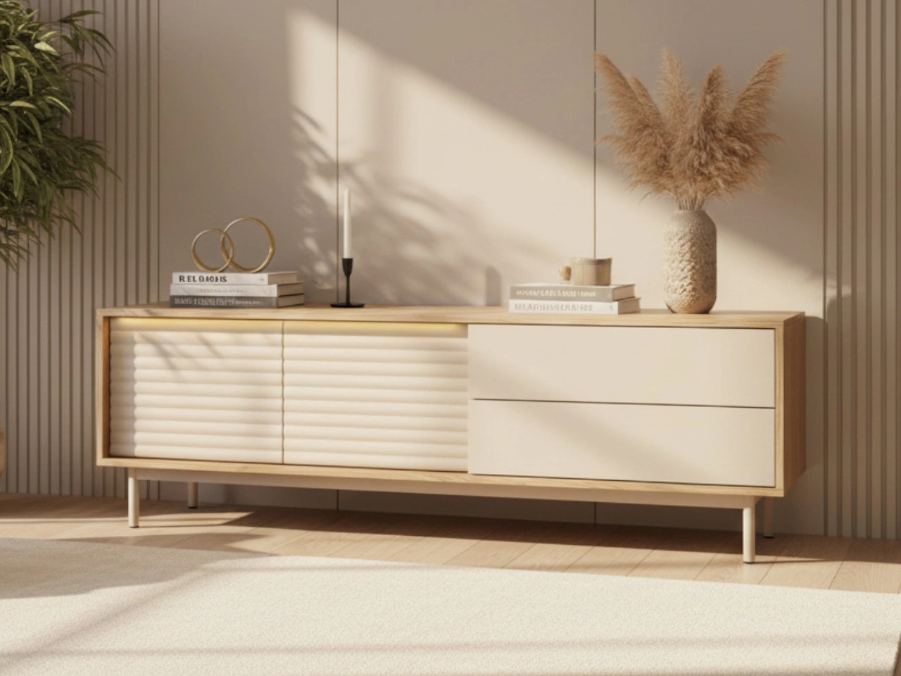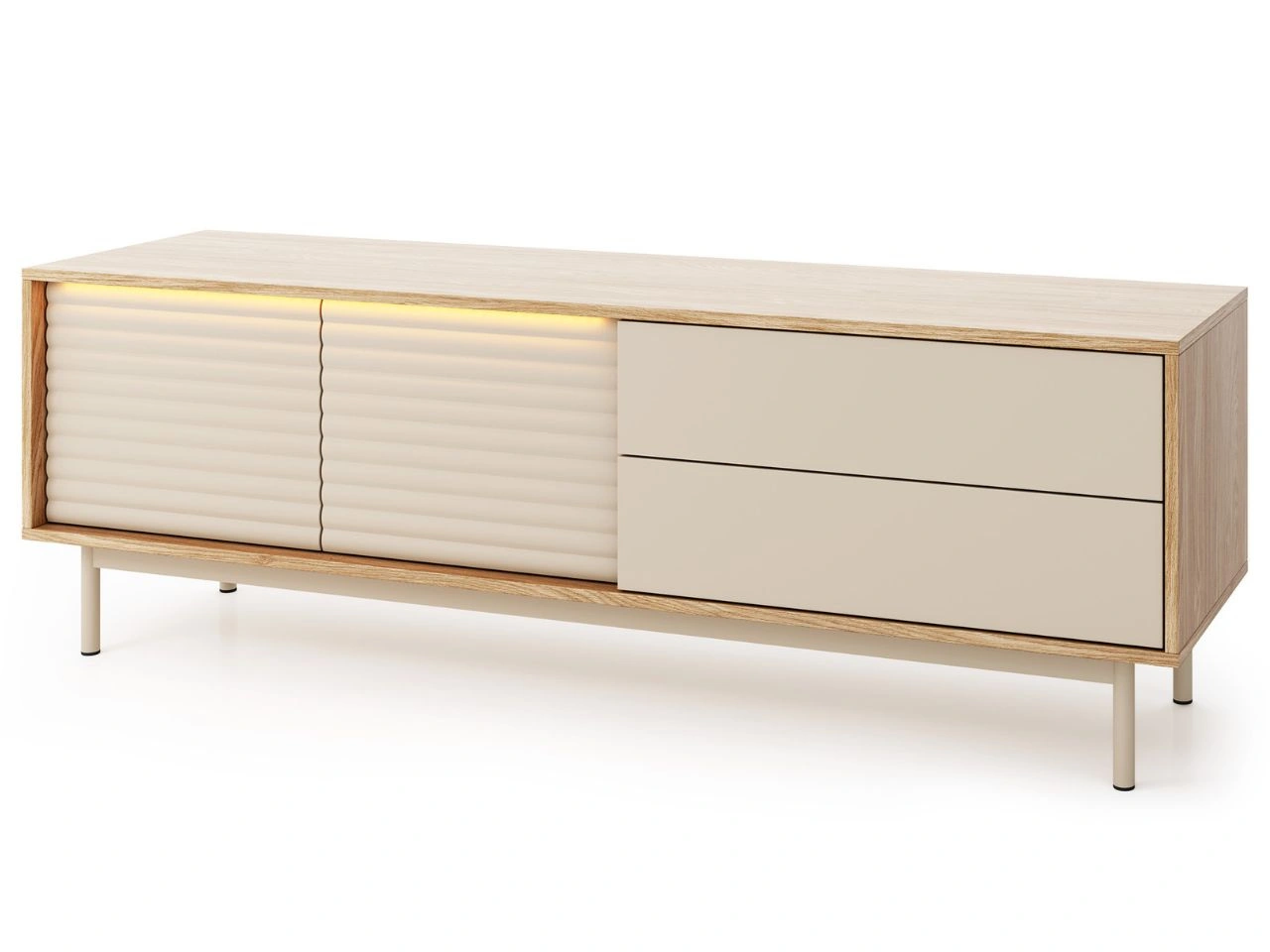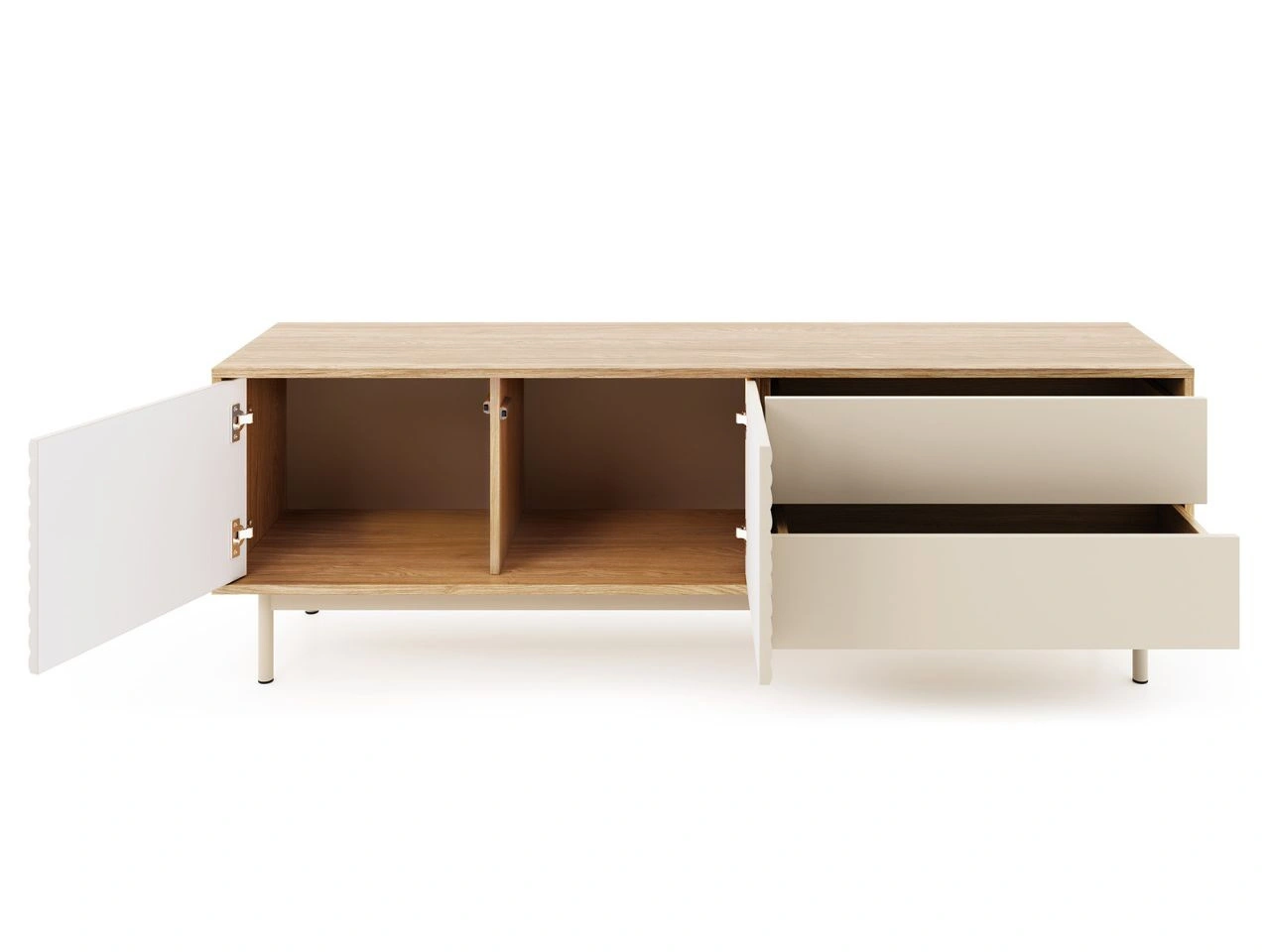 Das TV-Board bietet durchdachte Stauraumlösungen – hinter den gerillten Türen befindet sich ein geräumiges Fach mit Einlegeboden, ideal für TV-Geräte, Konsolen oder Zubehör. Auf der rechten Seite befinden sich zwei breite Schubladen, die zusätzlichen Platz für Fernbedienungen, Kabel, Multimedia oder kleine Wohnaccessoires bieten. Alle Fronten verfügen über ein Push-to-Open-System, sodass das Möbelstück eine glatte, grifflose und minimalistische Optik behält.