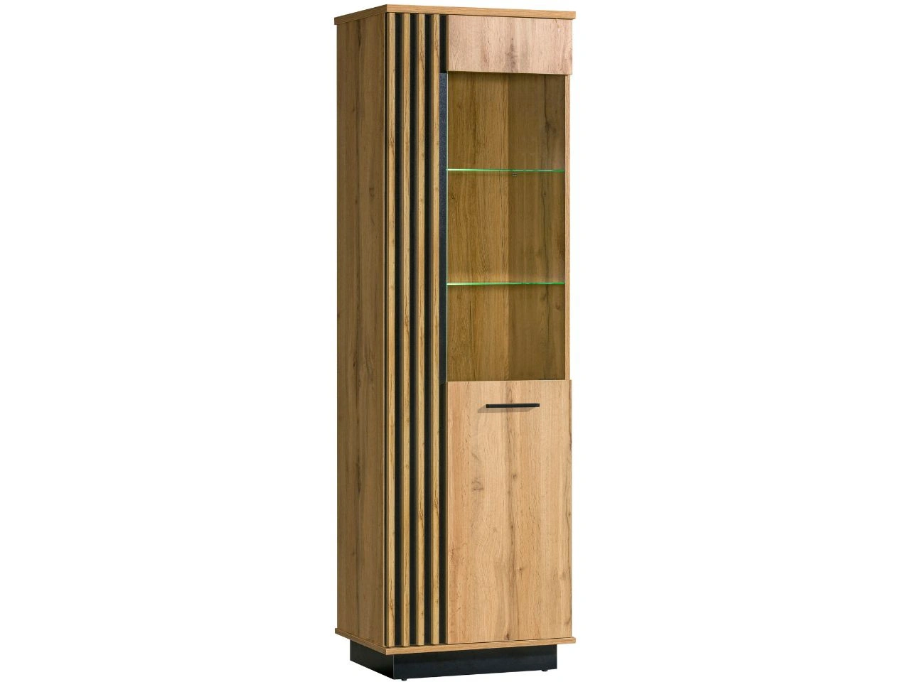 Die Vitrine Lavore ist ideal für alle, die Funktionalität mit einer stilvollen Präsentation ihrer Lieblingsdekorationen verbinden möchten. Ihr modernes, leicht industrielles Design wird durch dekorative vertikale Lamellen betont, die einen eleganten, auffälligen Akzent setzen. Die Glastür verleiht der Vitrine Leichtigkeit und ermöglicht gleichzeitig, Glas, Bücher oder Dekorationen ansprechend zu präsentieren. Das Innenleben der stehenden Vitrine wurde so gestaltet, dass Ästhetik und Praktikabilität perfekt kombiniert werden. Geräumige Einlegeböden bieten viel Platz zur ordentlichen Aufbewahrung, während die LED-Beleuchtung den Inhalt dezent in Szene setzt und eine stimmungsvolle Atmosphäre im Wohnzimmer oder Essbereich schafft.
