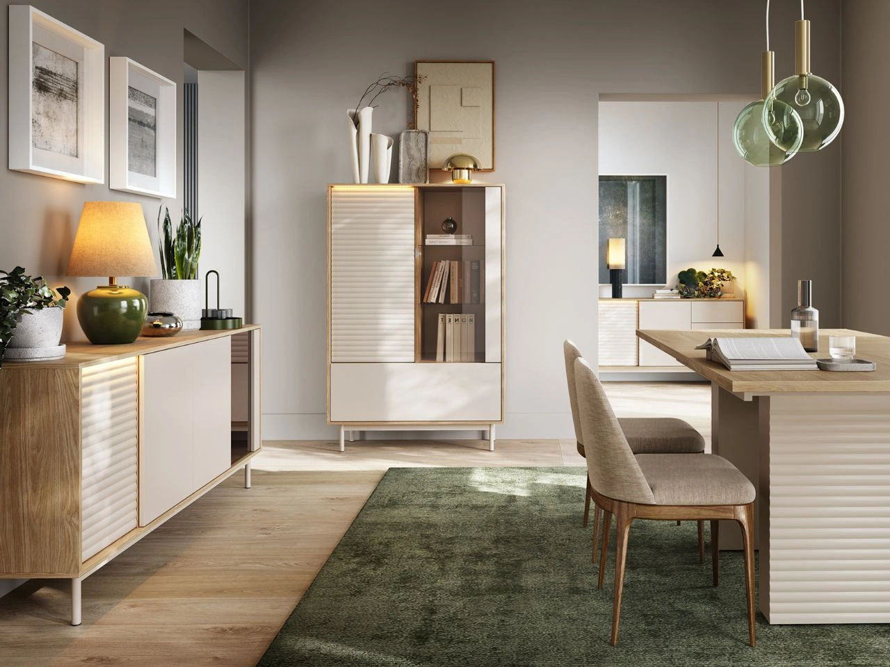 Ergänzt wird das Set durch eine schlanke Vitrine mit verglastem Oberteil sowie einem geschlossenen Unterschrank, der zusätzlichen Stauraum bietet und die Präsentationsfunktion des Ensembles sinnvoll ergänzt. Das Möbelset harmoniert perfekt mit dem Esstisch Rapallo und schafft eine einheitliche, elegante Wohn- und Esszone.
