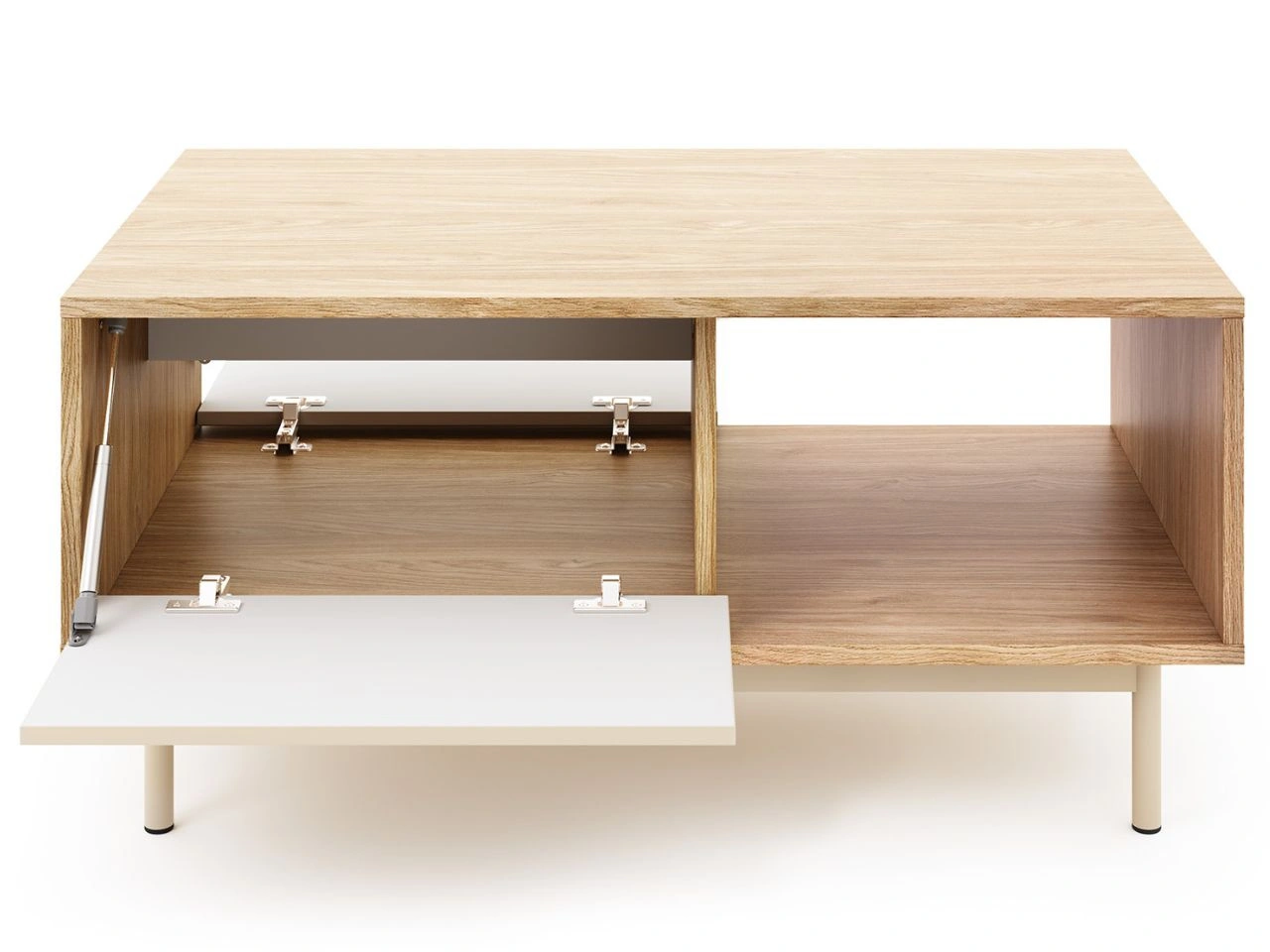Den Wohnbereich vervollständigt ein Couchtisch mit geschlossenem Stauraum, der eine praktische Ablage für Bücher, eine Kaffeetasse oder dekorative Accessoires bietet. Die nach unten öffnenden Fronten ermöglichen ein aufgeräumtes Erscheinungsbild, während Form und Details stilistisch auf die übrigen Möbel der Kollektion Rapallo abgestimmt sind.