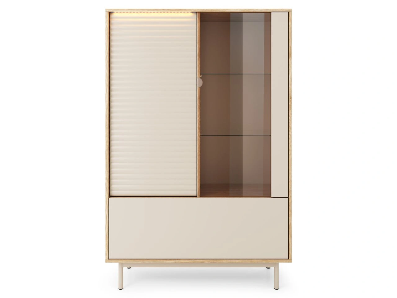 Im Mittelpunkt des Wohnbereichs steht das TV-Lowboard mit Schubladen, das praktischen Stauraum für Multimedia-Geräte und Zubehör bietet. Seine niedrige, längliche Form fügt sich ideal in die Gestaltung der TV-Wand ein. Ergänzt wird das Ensemble durch eine Vitrine mit teilweiser Verglasung, die eine stilvolle Präsentation von Büchern, Dekorationen oder Geschirr ermöglicht, während der untere, geschlossene Schrankbereich zusätzlichen, diskreten Stauraum bietet.