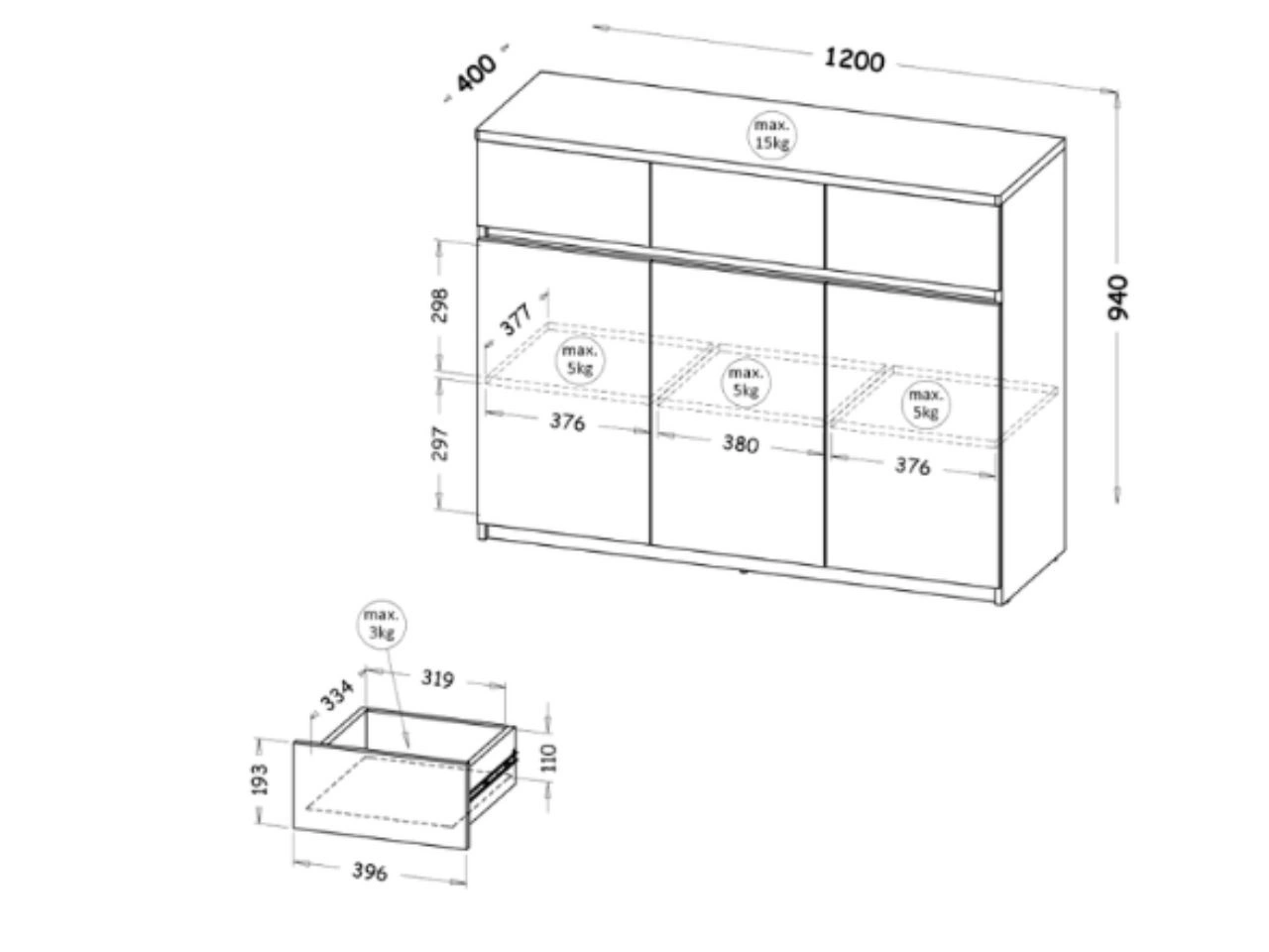 Die Möbel sind aus laminierter Möbelplatte gefertigt, die für den täglichen Gebrauch geeignet ist. Die Kanten sind mit ABS/PCV-Kanten geschützt, und die Schubladen sind mit Kugelführungen mit Vollauszug ausgestattet, was eine komfortable und leichtgängige Nutzung gewährleistet.