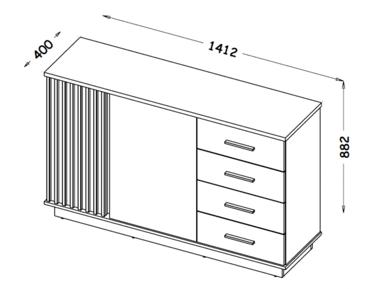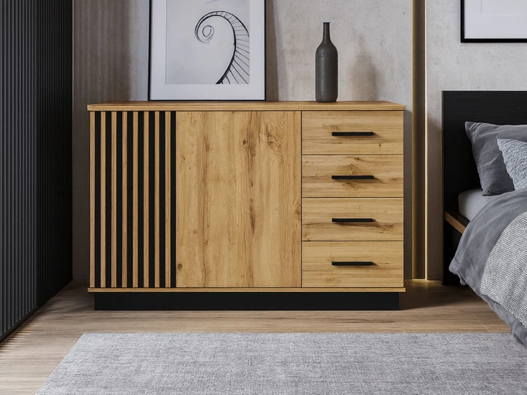Ein charakteristisches Detail dieser Kommode für das Wohnzimmer sind die vertikalen MDF-Lamellen auf einer der Fronten. Sie betonen den industriellen Charakter der Lavore-Kollektion und verleihen dem Möbelstück eine dekorative, moderne Tiefe. Die Konstruktion besteht aus einer robusten, laminierten Platte, die widerstandsfähig gegenüber alltäglicher Nutzung ist – dadurch wird diese elegante Kommode mit Schubladen nicht nur zu einem stilvollen, sondern auch zu einem langlebigen und praktischen Element jeder Einrichtung.