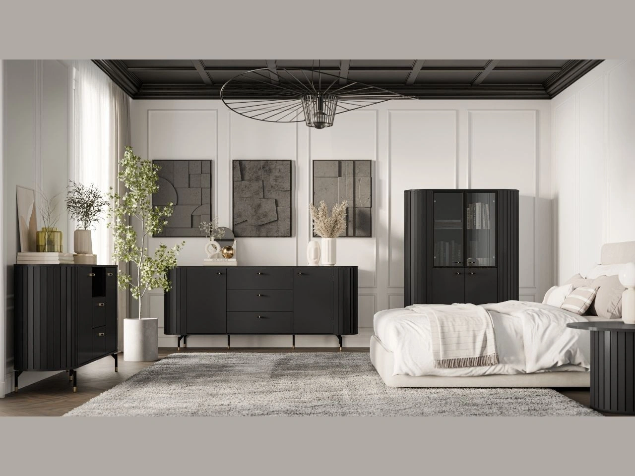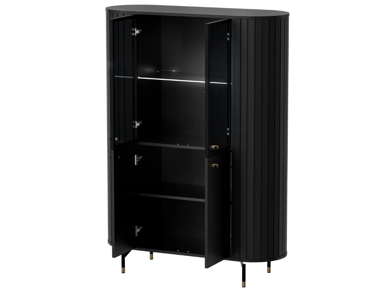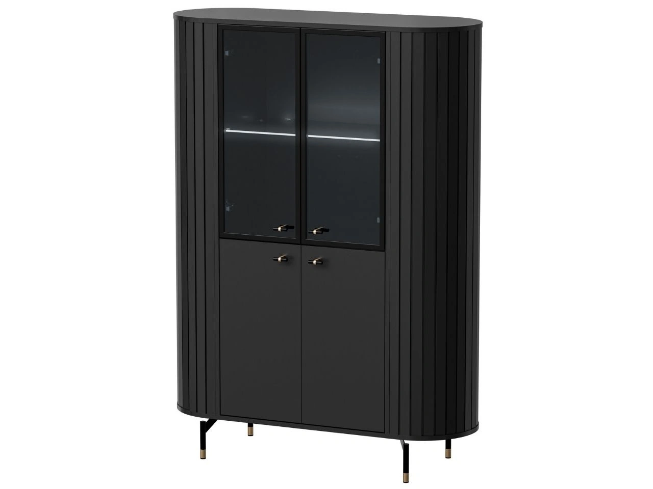 Die Vitrine Soria ist eine stilvolle Lösung für moderne und elegante Wohnräume, in denen Design und Funktionalität gleichermaßen zählen. Die Kombination aus dem dezenten farbe, vertikalen Riffelungen sowie schwarz-goldenen Details verleiht dem Möbelstück einen edlen Charakter und passt perfekt zu Glamour-, Modern-Classic- und modernen Einrichtungen.