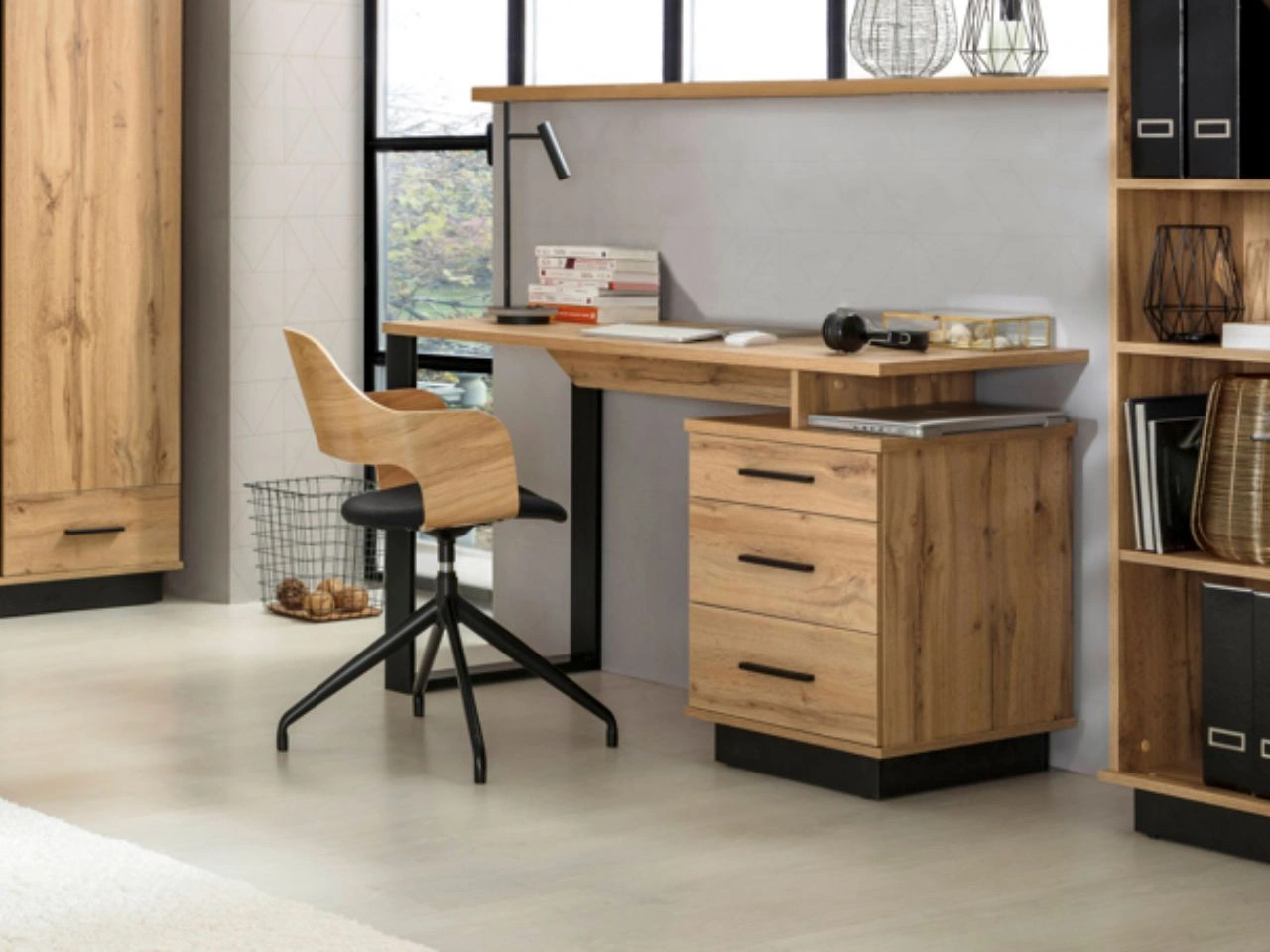 Detail ist das stabile schwarze Gestell an der Seite, das dem Industrie-Schreibtisch einen klaren Loft-Charakter verleiht und zugleich für hohe Standfestigkeit sorgt. Gefertigt aus robusten, langlebigen Materialien, eignet sich dieser Schreibtisch für das Büro das Arbeitszimmer. Der Schreibtisch Lavore überzeugt als Büroschreibtisch mit Schubladen, durch Funktionalität, Stauraum und zeitgemäßes Design – ideal für alle, die einen modernen Schreibtisch im Industrial-Look suchen, der Ordnung schafft und den Raum stilvoll aufwertet.