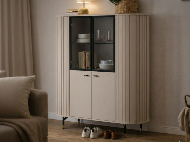 Die Kollektion Soria ist eine elegante Möbelserie für Wohn- und Esszimmer, entworfen für moderne Interieurs. Vertikale Riffelungen, sanft abgerundete Kanten sowie die Farbvarianten Schwarz oder Kaschmir verleihen den Möbeln einen zeitlosen und edlen Charakter. Schwarz-goldene Details in Form von Stahlfüßen und Griffen unterstreichen den modernen Glamour-Stil. Durchdachte Innenaufteilungen, gehärtetes Glas und LED-Beleuchtung sorgen für eine gelungene Verbindung aus Ästhetik und Alltagstauglichkeit.