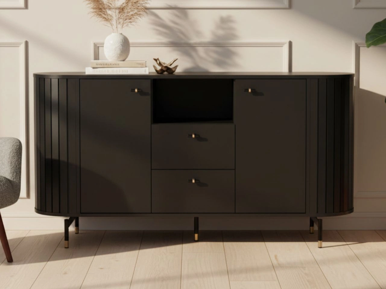 Die Kommode Soria ist eine stilvolle und praktische Lösung für moderne Wohnräume, Essbereiche sowie elegante Wohnzonen. Ihre sorgfältig gestaltete Form verbindet eine dezente Farbgebung, vertikale Riffelungen und markante schwarz-goldene Akzente zu einer harmonischen Gesamtkomposition, die perfekt zu Glamour-, Modern-Classic- und zeitgemäßen Einrichtungen passt.