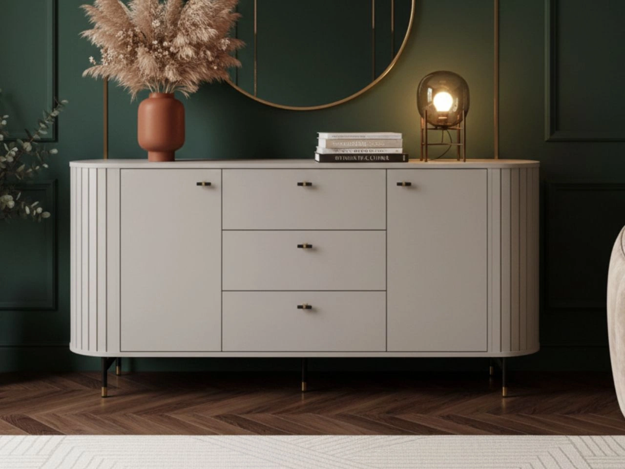 Die Kommode Soria ist eine stilvolle und praktische Lösung für moderne Wohnräume, Essbereiche sowie elegante Wohnzonen. Ihre sorgfältig gestaltete Form verbindet eine dezente Farbgebung, vertikale Riffelungen und markante schwarz-goldene Akzente zu einer harmonischen Gesamtkomposition, die perfekt zu Glamour-, Modern-Classic- und zeitgemäßen Einrichtungen passt.