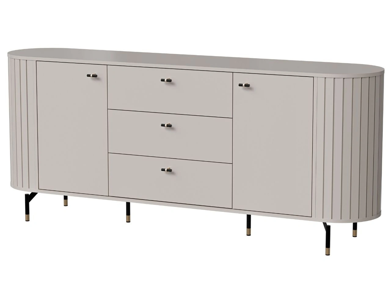 Der Korpus und die Fronten bestehen aus laminierter Spanplatte mit einer Stärke von 16 mm und werden durch dekorative MDF-Elemente ergänzt, die der Form Tiefe und einen eleganten Charakter verleihen. Sanft abgerundete Seiten in Kombination mit rhythmisch angeordneten Riffelungen betonen die hochwertige Optik und heben die Kommode von klassischen Modellen ab.