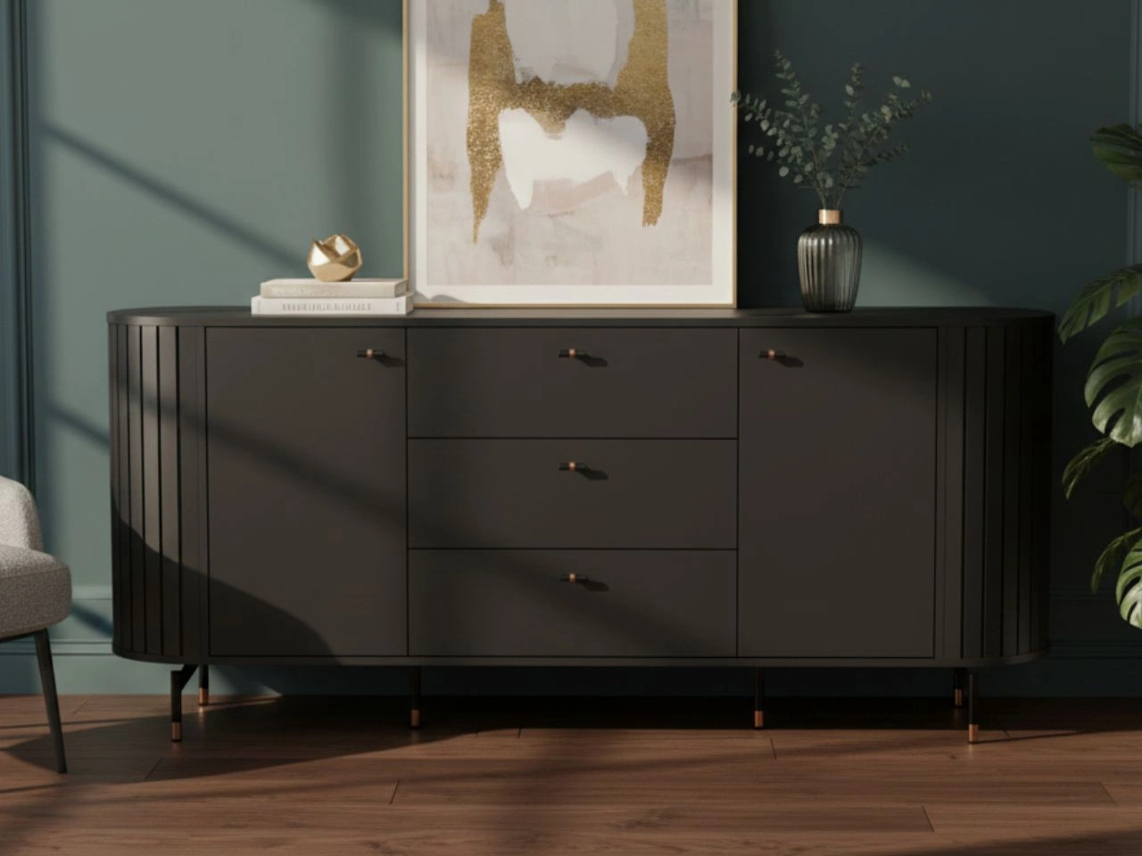 Die Kommode Soria ist eine stilvolle und praktische Lösung für moderne Wohnräume, Essbereiche sowie elegante Wohnzonen. Ihre sorgfältig gestaltete Form verbindet eine dezente Farbgebung, vertikale Riffelungen und markante schwarz-goldene Akzente zu einer harmonischen Gesamtkomposition, die perfekt zu Glamour-, Modern-Classic- und zeitgemäßen Einrichtungen passt.