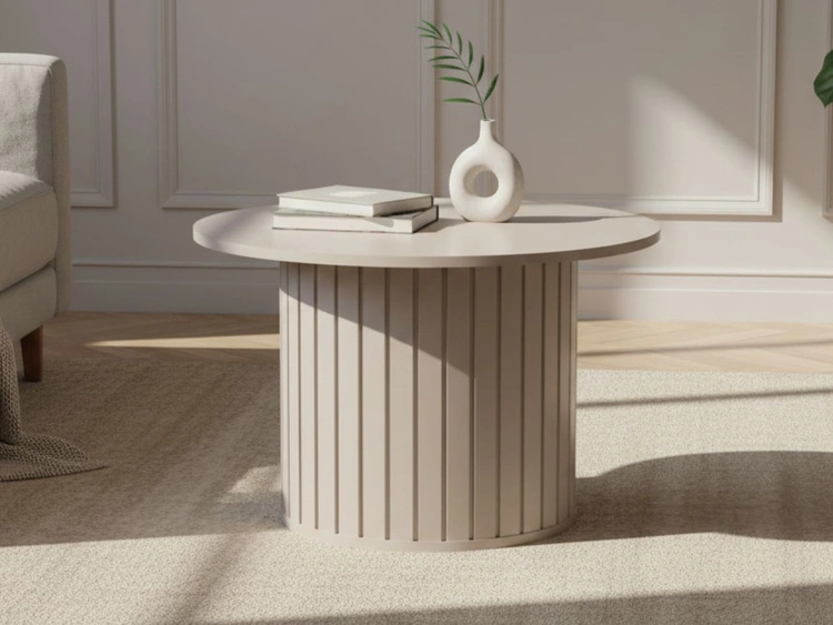 Das Möbelstück besteht aus laminierter Spanplatte und wird durch dekorative MDF-Elemente ergänzt, was für Stabilität, Langlebigkeit und eine hochwertige Optik sorgt. Die runde Tischplatte eignet sich ideal als Ablage für Kaffee, Dekorationen oder alltägliche Accessoires und schafft eine funktionale Fläche im Wohnbereich.