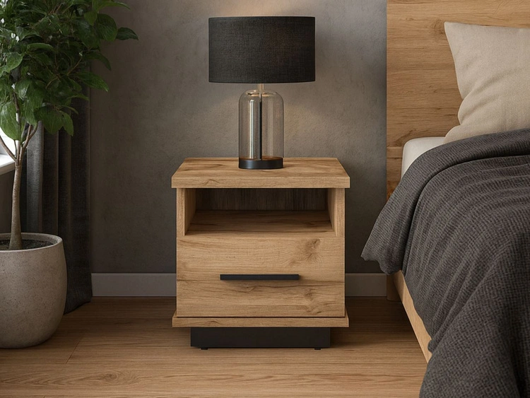 Der Nachttisch Lavore ist eine moderne und funktionale Nachttischkommode, die perfekt in ein zeitgemäßes Schlafzimmer passt und praktischen Komfort mit stilvollem Design verbindet. Der Nachttisch mit Schublade ist mit einer geräumigen Schublade auf kugelgelagerten Führungen ausgestattet, die ein leises, leichtgängiges Öffnen ermöglicht und idealen Stauraum für Bücher, Brille, Ladegeräte oder andere Alltagsgegenstände bietet. Der schwarze Kunststoffgriff unterstreicht den industriellen Charakter des Nachttisches fürs Schlafzimmer und setzt einen modernen Akzent neben dem Bett.
