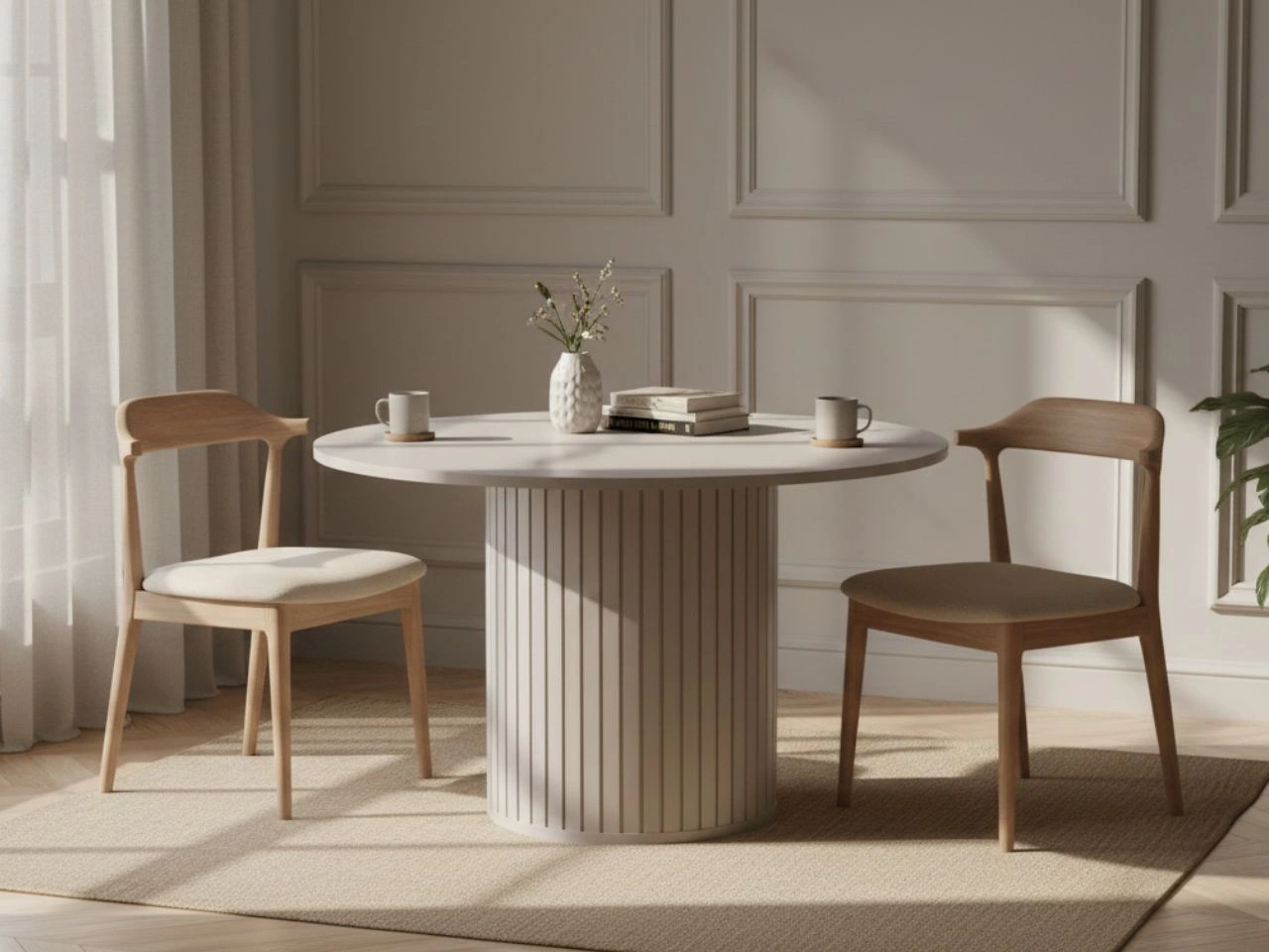 Ein charakteristisches Merkmal des Tisches ist die zentrale, geriffelte Säulenbasis, die sofort ins Auge fällt und der Form einen ausdrucksstarken, dekorativen Charakter verleiht. Die vertikalen Fräsungen sorgen für Rhythmus und Eleganz und passen perfekt zu Glamour-, Modern-Classic- sowie modernen Einrichtungskonzepten.