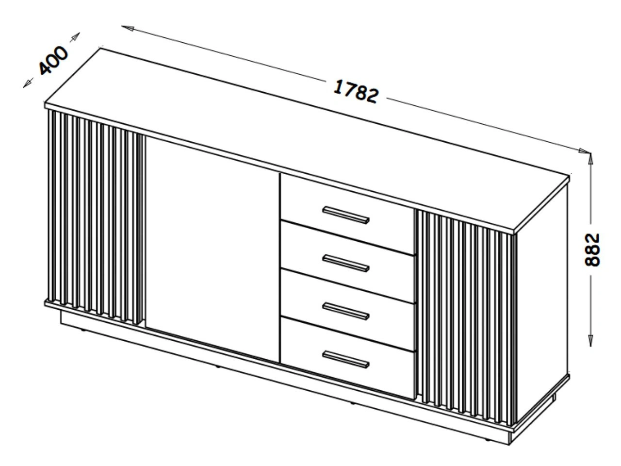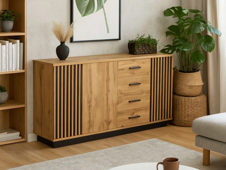 Die Kommode mit Schubladen ist ein beeindruckendes, besonders geräumiges Möbelstück, das sich perfekt in moderne und industrielle Wohnräume einfügt. Mit einer Breite von knapp 180 cm ist diese große Kommode fürs Wohnzimmer, Esszimmer oder Schlafzimmer eine ideale Lösung für alle, die viel Stauraum mit ausdrucksstarkem Design verbinden möchten. Mehrere praktische Schubladen auf Rollenführungen eignen sich hervorragend zur Aufbewahrung kleinerer Gegenstände, Dokumente oder Textilien, während drei geschlossene Türen großzügige Fächer für größere Utensilien bieten und für Ordnung sorgen.