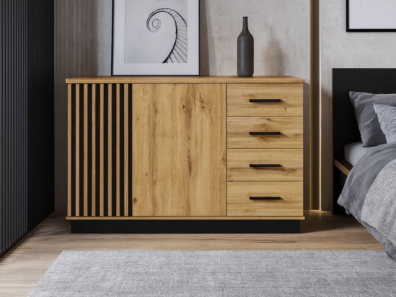 Die Kommode mit Schubladen und Türen erlaubt das Verstauen größerer Gegenstände und verbindet Funktionalität mit einem designorientierten Finish.