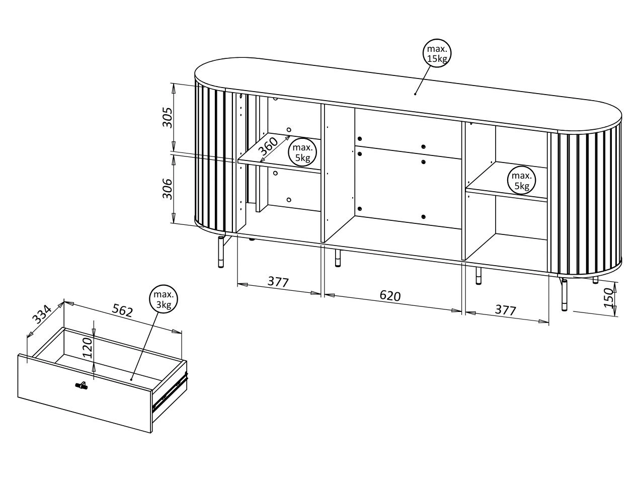 Korpusse und Fronten aller Elemente bestehen aus laminierter Spanplatte mit einer Stärke von 16 mm und werden durch dekorative MDF-Zierleisten ergänzt. Strapazierfähige PCV-Kanten erhöhen die Widerstandsfähigkeit im täglichen Gebrauch. Schräge Stahlfüße heben die Möbel optisch an und verleihen ihnen Leichtigkeit sowie eine elegante Ausstrahlung.